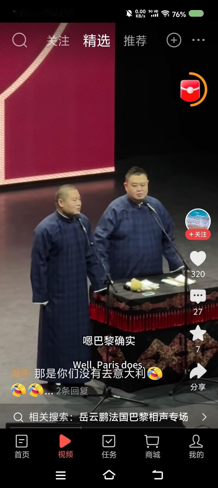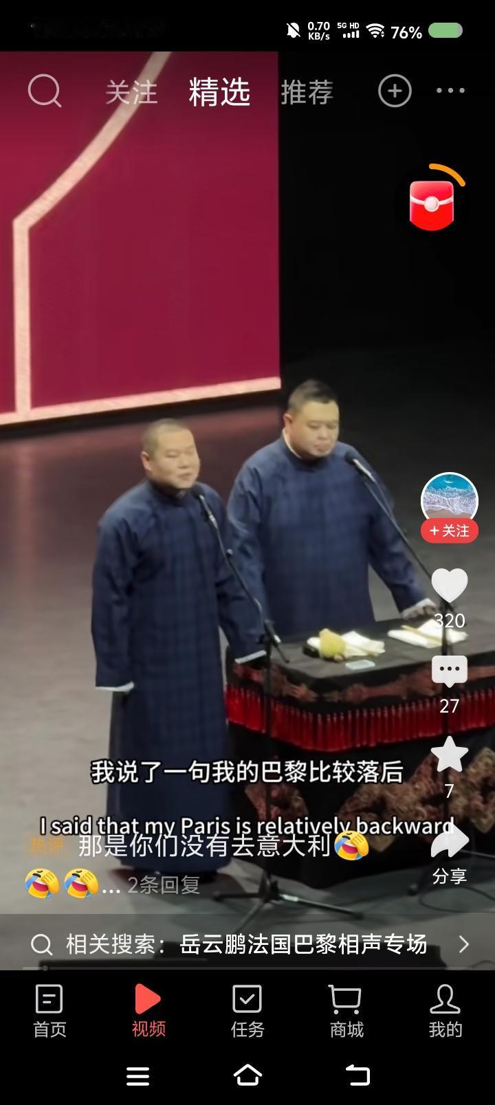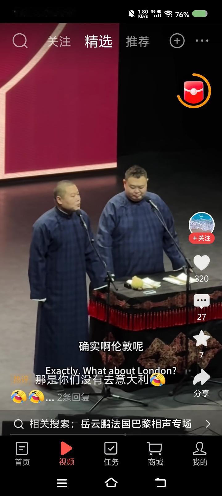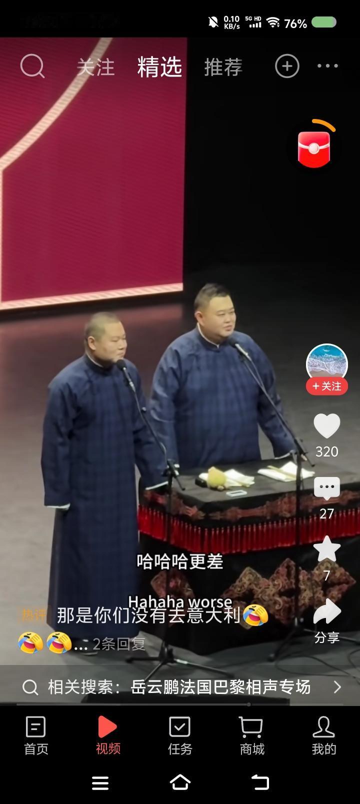 岳云鹏的巴黎专场—— 网上视频:岳云鹏孙越相声专场世界巡演,巴黎站。听了这一小段,不错。搜了一段十几分钟的,妈呀! 说实话,有点垮。内容有点旧不说,表演状态过于随意,一会儿进去一会儿出来,既当演员又当观众,自个儿笑了,应该不是笑场了。 你看郭老师于老师说相声,虽然也有旧包袱,但很严谨,收放自如,就是演员的状态,非常稳健。怎么徒弟说相声跟耍猴似的,吐字不清的,卖萌的,喊叫的……整体给人一个感觉:闹。
