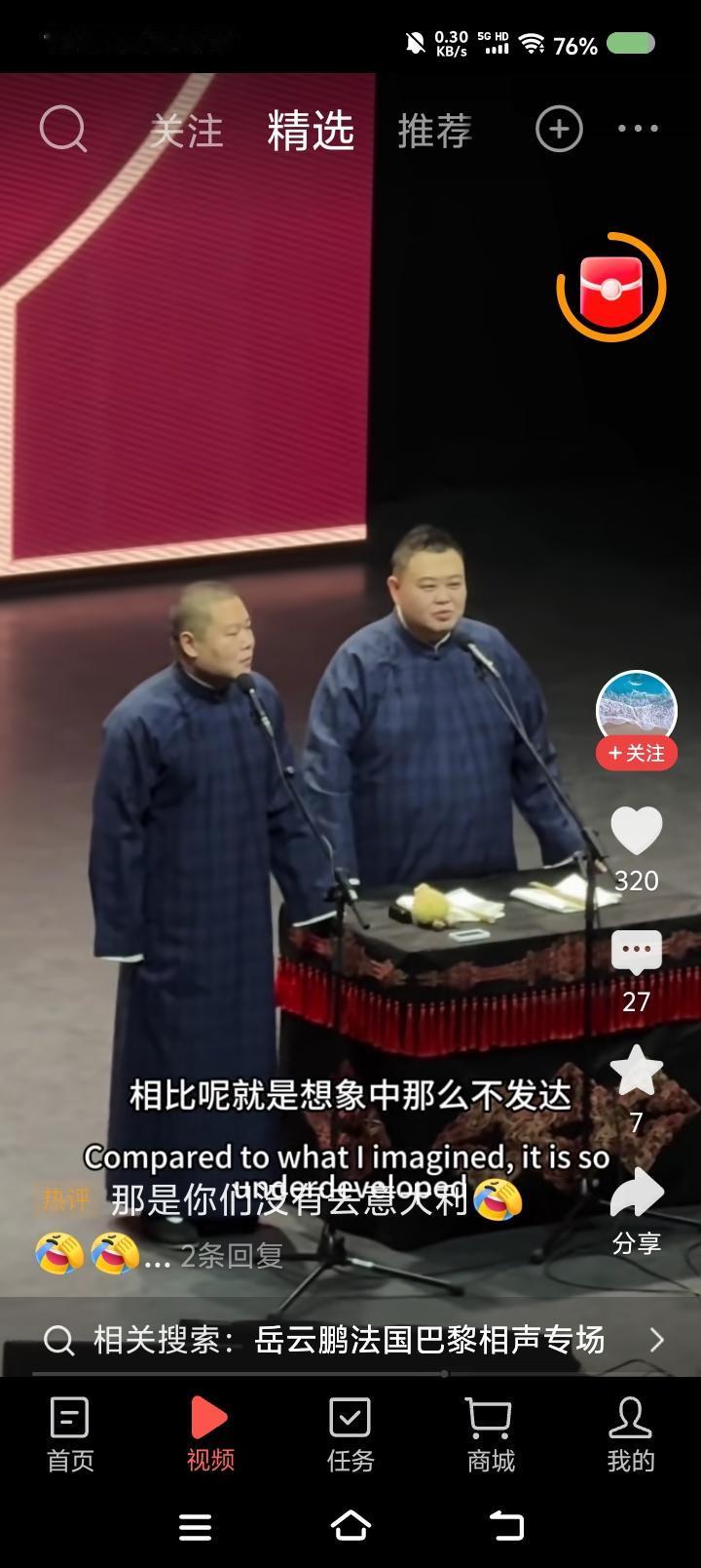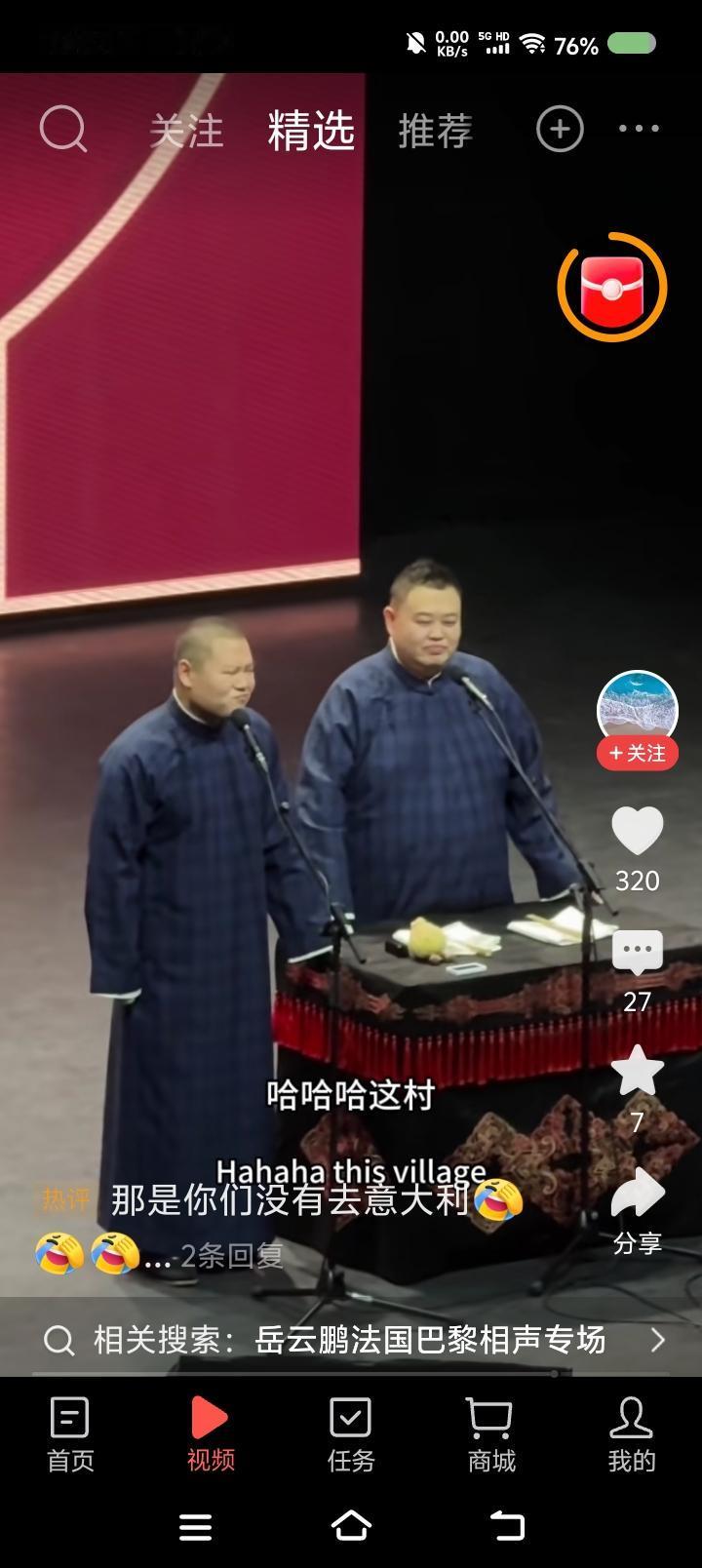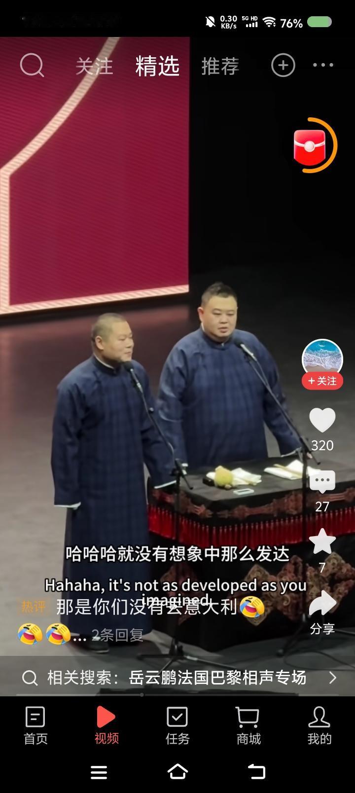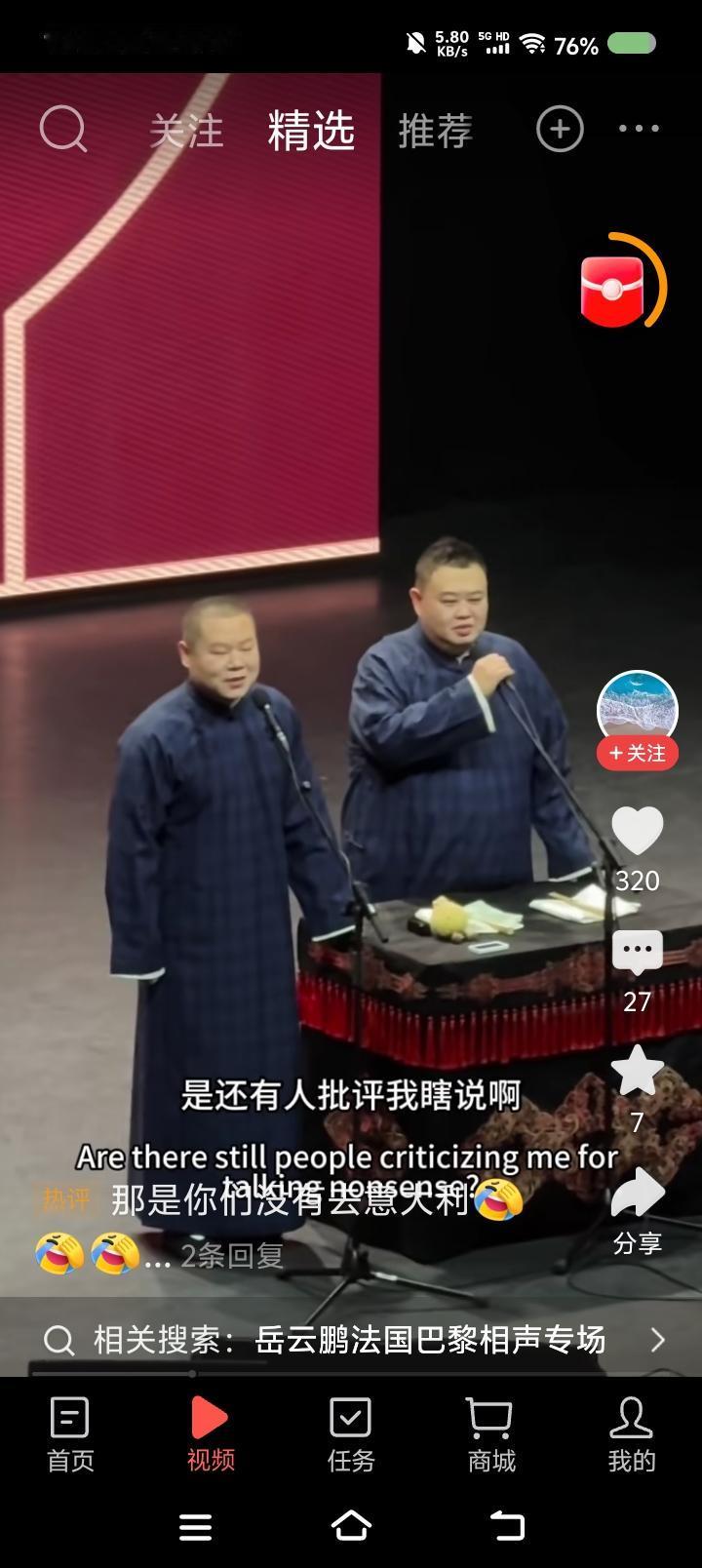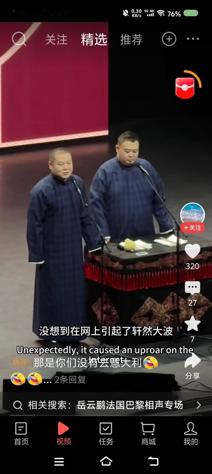 岳云鹏的巴黎专场—— 网上视频:岳云鹏孙越相声专场世界巡演,巴黎站。听了这一小段,不错。搜了一段十几分钟的,妈呀! 说实话,有点垮。内容有点旧不说,表演状态过于随意,一会儿进去一会儿出来,既当演员又当观众,自个儿笑了,应该不是笑场了。 你看郭老师于老师说相声,虽然也有旧包袱,但很严谨,收放自如,就是演员的状态,非常稳健。怎么徒弟说相声跟耍猴似的,吐字不清的,卖萌的,喊叫的……整体给人一个感觉:闹。