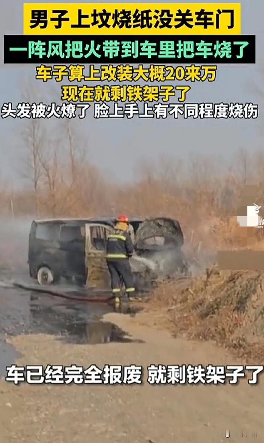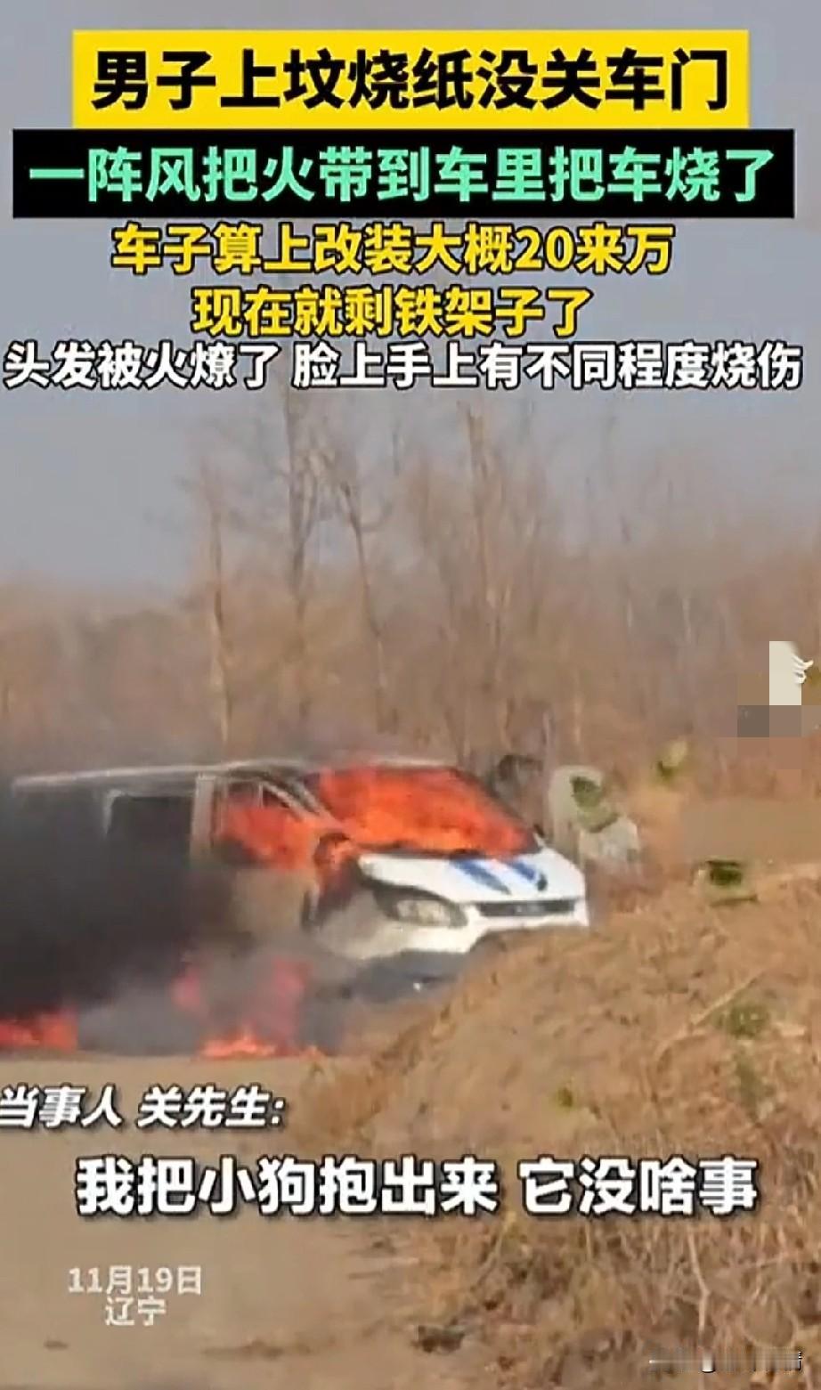 男子上坟烧纸没关车门, 一阵风把火带到车里把车烧了, 这还真是造化弄人, 车子算上改装花了20多万, 如今只剩下车架, 头发还被烧, 脸上手上都有不同程度的烧伤, 还带着小狗, 着火的时候他把小狗给救下来了 这风刮的也太巧了, 上坟烧纸还是要注意安全, 否则就会像关先生一样, 起大风天气烧纸一定要注意, 幸亏人没有多大事儿, 不然就亏大发了, 虽然习俗不能改, 但是烧纸一定要注意安全, 尤其是周围非常多的荒草, 千万不要引起大范围的火灾, 要不然人还要进去, 大家对于关先生上坟烧纸把自己车给烧了怎么看? 上坟烧纸 烧纸风俗 祈福烧纸 马路烧纸 农村清明烧纸