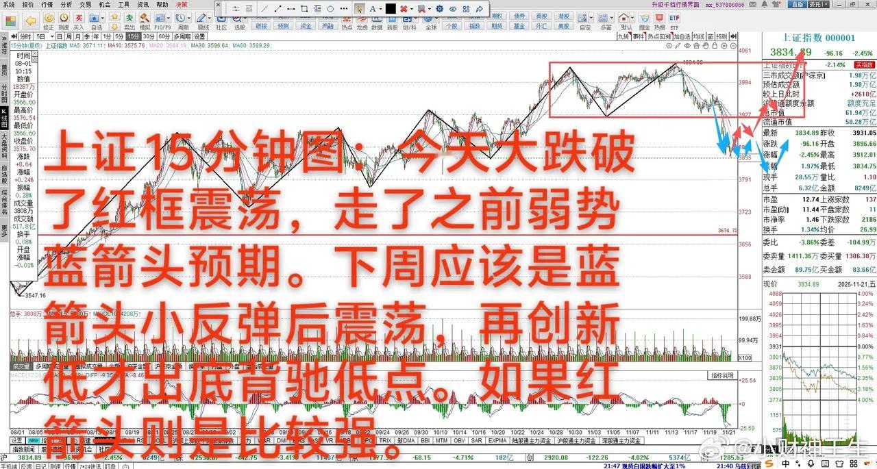 大A:不及预期,中长期放宽大震荡 11月21日 大A下跌2.45%,今天大跌下来,破了3922-4034点震荡,回到3732-3936点震荡,4035点没那么快能突破,接下来应该3732-4034点放宽震荡。短期4034点小级别下跌结构,跳空低开大跌下去,比预期要差,直接破了3922点,并不背驰,下午小反拉3878高点,反抽告别3922点,下周应该有小反弹,然后走成3834-3878点小震荡,震荡充分再创新低,才能迎来底背弛低点。 沪深300下跌2.44%,今天跳空大跌下来,正好回踩到4450高点,回到中期最后防守位,当前还看成中期上涨趋势4450-4761点放宽的震荡,下周应该4450-4527点小震荡,有可能会略破4450点,随后关注能否拉上来,如果拉不回4450点上方,中期走弱了。主观预期应该能拉上来,震荡上涨。 科创50下跌3.19%,今天跳空低开大跌,中期结构接下来是1210-1588点放宽震荡。今天创新低,比预期要弱,开盘直接跌穿1300点,并不背驰,下周应该有小反弹,走成1282-1327点小震荡,震荡充分再创新低,经过了今天的恐慌释放,再创新低迎来底背弛低点概率非常大,最后的防守位1210点。 创业板下跌4.02%,今天跳空低开大跌,直接破了2927点略创新低,但没有反抽告别2927点,下周小下探后反弹,走成2920-3039点小震荡,震荡充分后,经过今天恐慌释放,就算再创新低,大概率是下不去,迎来短期低点。如果下周直接小震荡,震荡上涨,那2920点就是短期低点。 今天领涨的题材概念:中船系、Sora概念。恐慌释放市场,只有这2个板块红盘,全市场不到10%的上涨。前面强势电池等大幅下跌。中期看,这波调整下来,前面强势板块icon涨幅不小,需要放宽的震荡才能更好的上涨,经过今天的恐慌释放,这次调整应该不远了。接下来市场止跌,能走强的板块主观预期是算力为首的大科技、人形机器人、电池、军工。中期跟踪情况:1、军工装备下跌1.02%,中期上涨趋势震荡结构。今天跳空低开下跌,随后反弹上冲,上不去再跌下来,短期2339点小级别下跌趋势,下周应该有小反弹,能冲过今天2298高点,短期保有上冲可能。如果下探靠近2198点收窄震荡,则还会创新低。2、低空经济下跌3.31%,中期上涨趋势1994-2210点区间震荡。今天低开大跌,已经逼近1994低点,盘中反拉上不去,下周会有小反弹,走成1994-2040点小震荡,应该没那么容易破下去,震荡后就算创新低,略破1994点,主观预期应该也能拉上来。如果出现跌穿1994点反抽告别,中期走弱了。3、证券下跌3.54%,中期上涨趋势震荡结构。今天大跌下来,不背驰,走得比预期要弱,下周小反弹,走成1594-1620点小震荡,再创新低后才是底背弛低点,开始反弹。4、消费电子下跌3.93%,今天的大跌破了震荡10700低点,盘中小反拉10698高点,形成了反抽告别10700-12087点震荡。下周应该会反弹,如果能强势拉起来,回踩确认不破10700点,短期止跌了,开始上涨结构。如果反弹过了1070点,又破下来,会走成10497-10912点小震荡,一旦再破下去,则中期走弱了。5、元件下跌4.8%,中期上涨趋势13269-15768点区间震荡。短期15768点小级别下跌结构,今天跳空低开下跌,并没有破13269低点,这是震荡下沿,是好位置。下周应该小反弹后走成13638-14140点小震荡,震荡充分再小新低,才是底背弛低点,大概到13269点附近。6、半导体下跌4.83%,今天大跌下来,整体中期结构是放宽的10076-13064点大震荡,从4899点上涨只13064点,涨幅不小,当前需要第二上涨趋势宽震荡,震荡充分上涨概率大,当前的调整下来,没改变大的上涨结构。今天跳空低开大跌,直接破11000点,比预期要弱,下周应该有反弹,如果能强势反弹上去,至少得过11354点,则10721点是低点。主观预期下周10721-11265点小震荡,震荡充分后再小新低,才是底背弛低点。短期跟踪情况:A、短期关注今天比较抗跌,一旦反弹就比较强,例如军工、SORA、文化传媒等。B、今天恐慌释放,短期关注电池、CPO、PCB、元件、机器人等小级别超跌,正好跌到重要支撑位置。