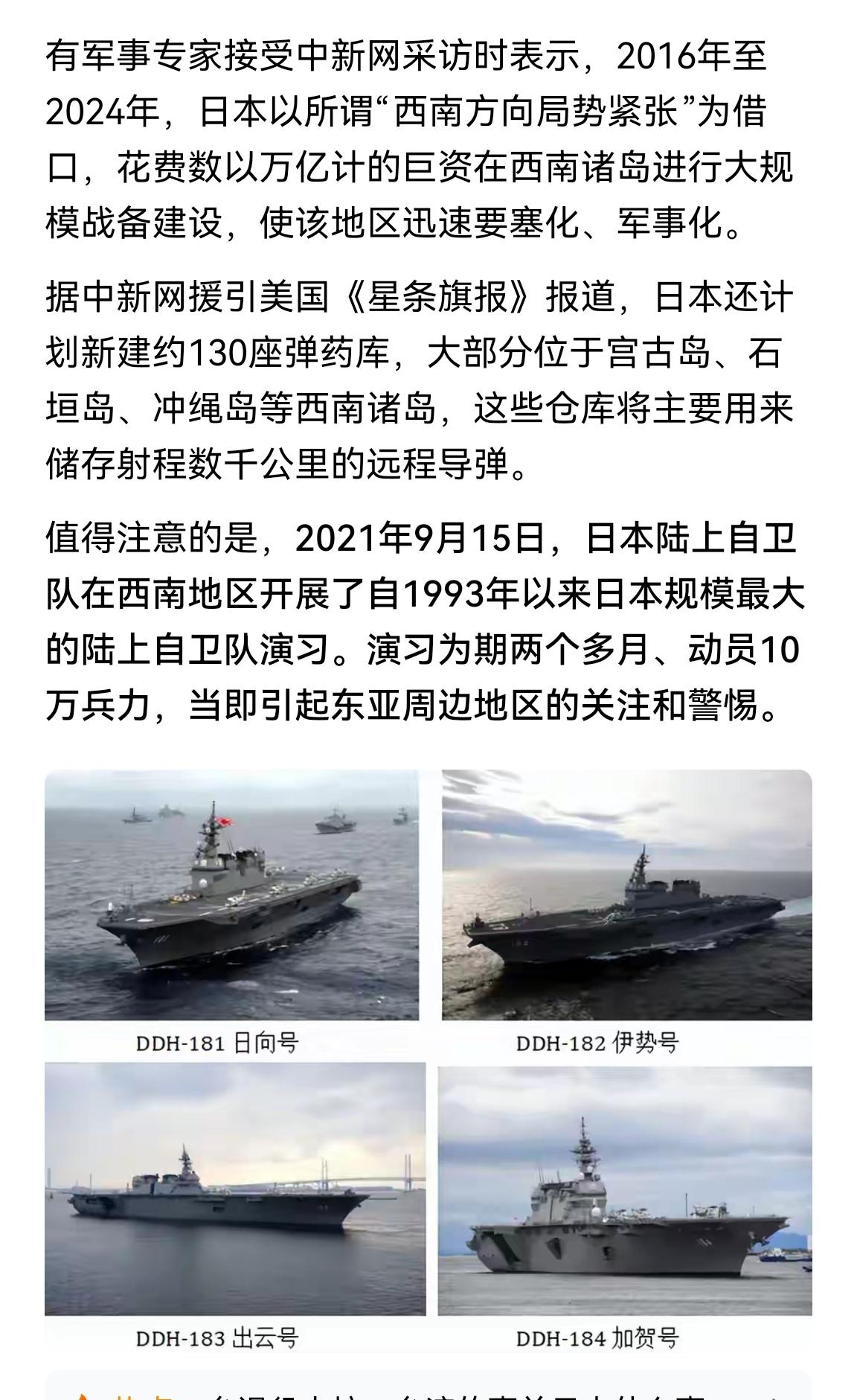 国内媒体直接指出:日本就是已经制定了军事介入我国统一的兵力与计划! 根据直新闻的报道,日本早在九年前的2016年就开始投入数以万亿的费用在临近西南方向进行战备建设。 无数座弹药库,机场,导弹发射基地分散在诸多岛屿上。 而且经常进行演习,并制定军事据点行动预案计划。 所以我们不能简单把早苗的言论看成她的一家之言。 而是要非常警惕的清楚:这是她背后整个国家正在执行的计划。 任何娱乐化与麻痹大意都是严重不负责任。 我们需要做的就是:料敌从宽!