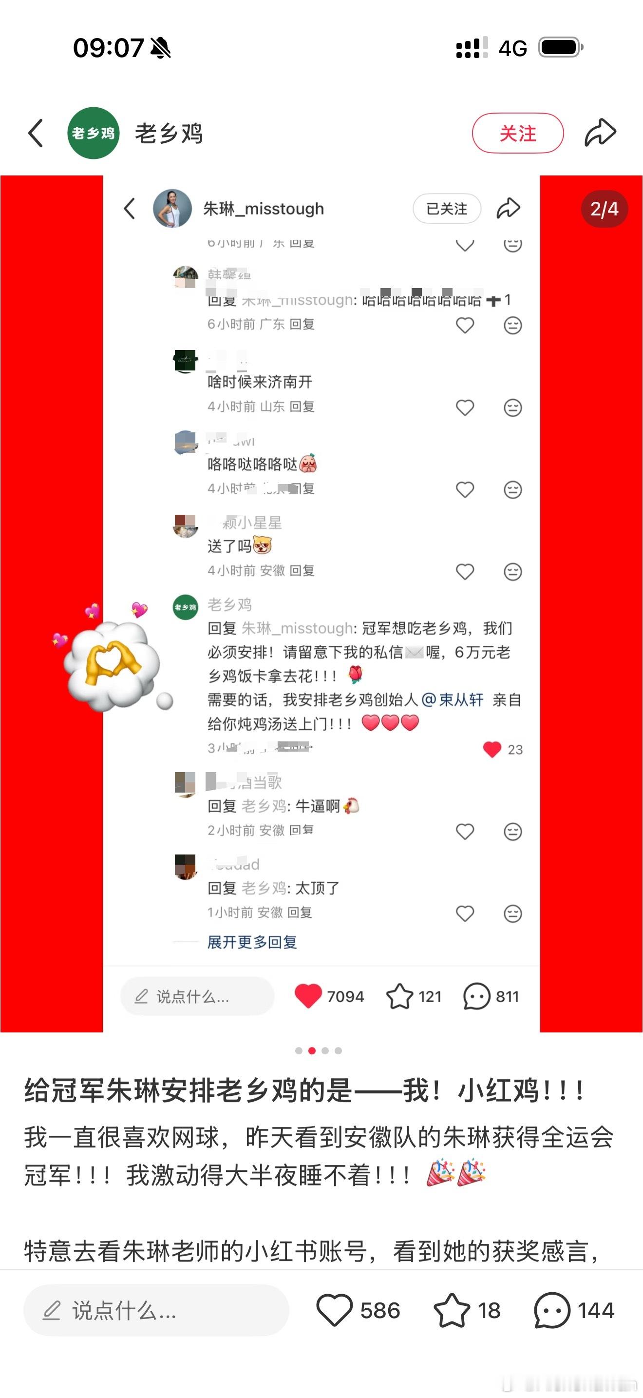 我勒个豆,朱琳获得第十五届全运会 网球项目女单金牌后,安徽本土餐饮品牌老乡鸡直接给送了6万的充值卡,还表示创始人要炖鸡汤送给朱琳喝