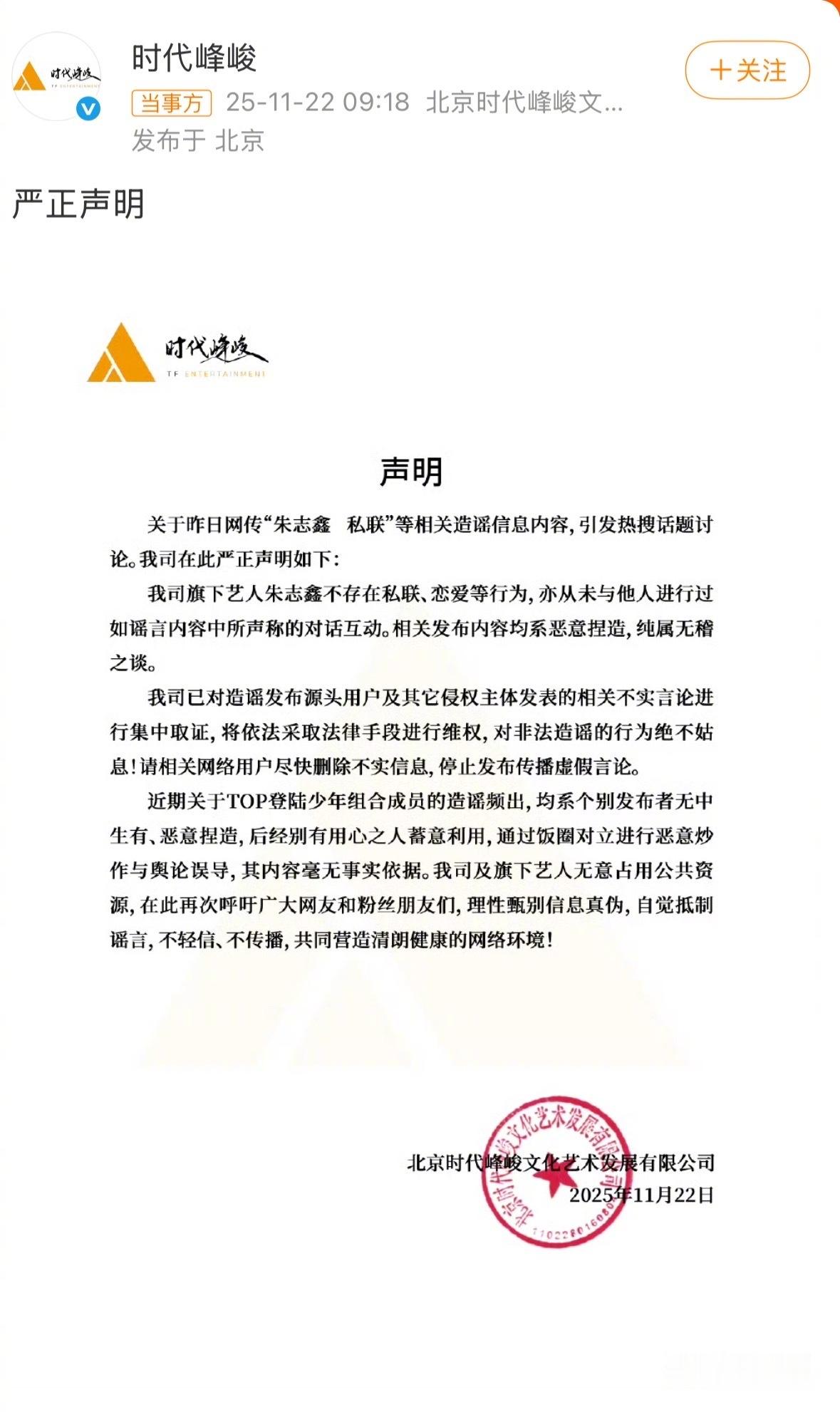 时代峰峻发布声明,否认旗下艺人朱志鑫存在私联、恋爱等行为,称网传所有对话内容均为恶意捏造,纯属无稽之谈。公司表示已对造谣源头取证,将依法维权。