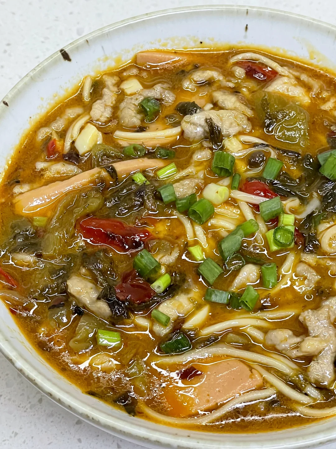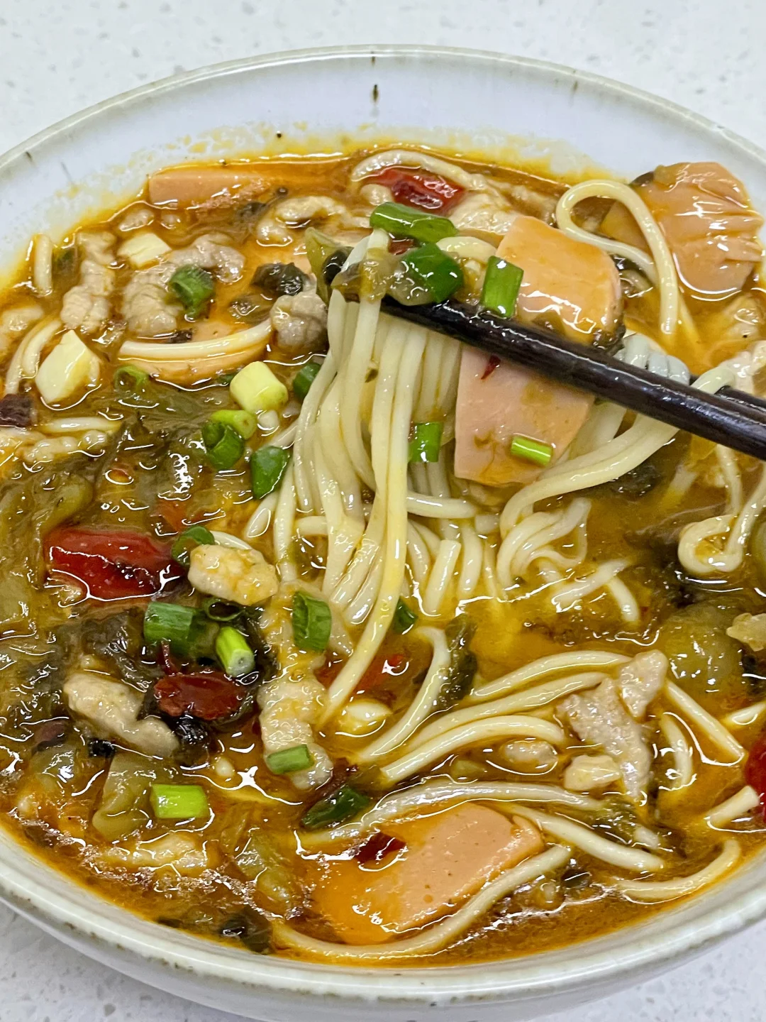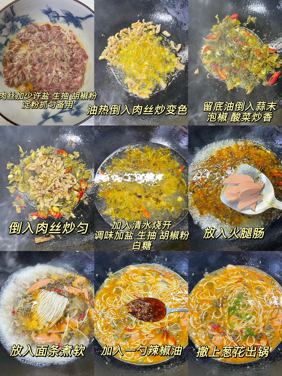 酸爽开胃汤汁都能喝完的酸菜肉丝火腿面,好吃又方便,一起来尝尝吧~ 1️⃣:肉丝加盐 生抽 胡椒粉味 水淀粉 食用油抓匀腌制一会儿 2️⃣:油热放入肉丝炒至变色捞出 再放入蒜末 泡椒 酸菜炒出香味 加入肉丝翻炒均匀 再加适量清水烧开 加生抽 盐 白胡椒粉 少许白糖调味熬煮几分钟 再放入面和火腿肠煮熟 起锅前加点鸡精 辣椒油 葱花即可