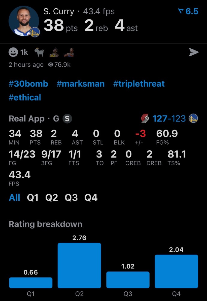 晚安了,勇士三连败! 开拓者赛季双杀勇士。 库里空砍38分4助攻3失误,正负值-3。