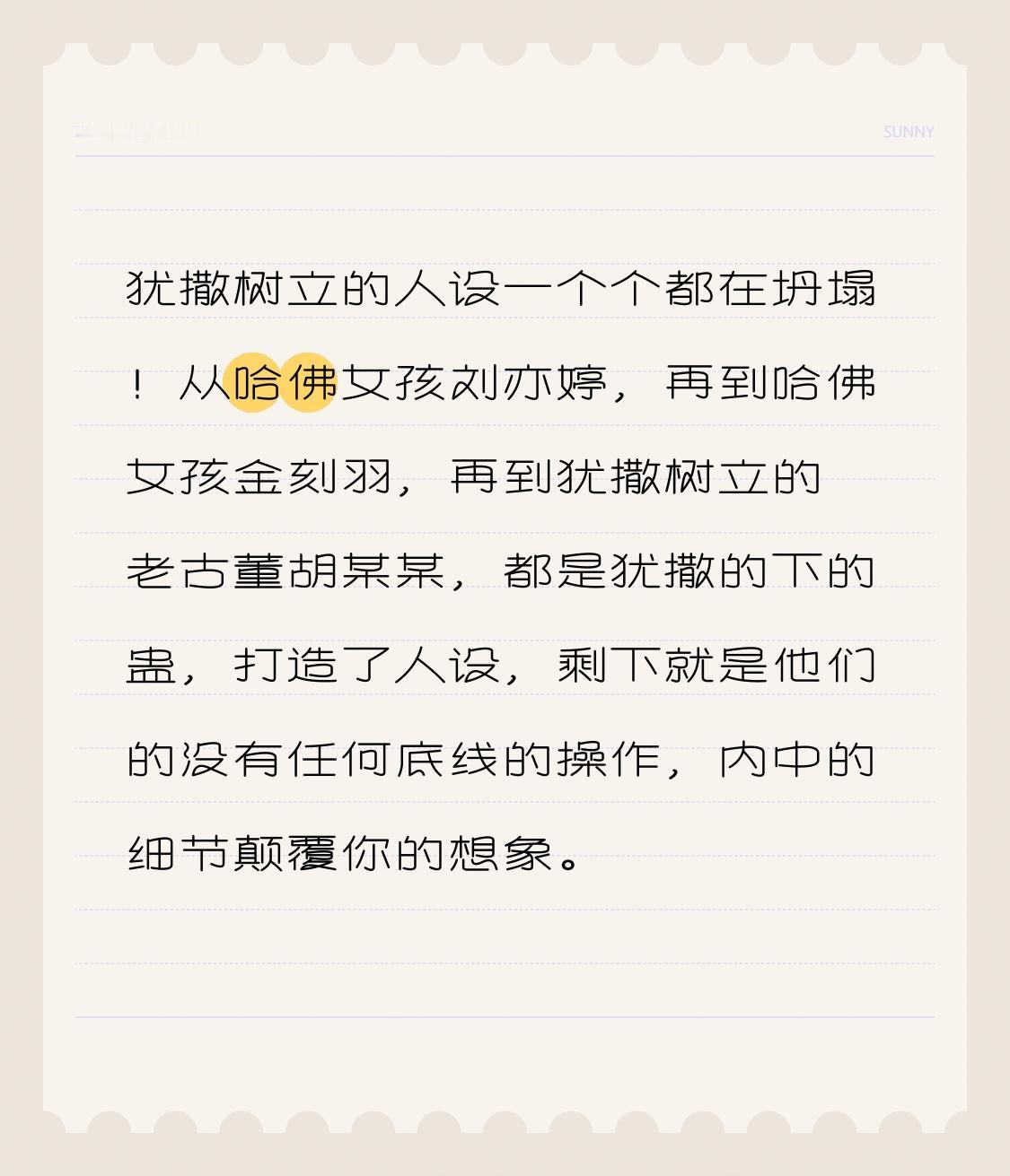 犹撒树立的人设一个个都在坍塌!从哈佛女孩刘亦婷,再到哈佛女孩金刻羽,再到犹撒树立的老古董胡某某,都是犹撒的下的蛊,打造了人设,剩下就是他们的没有任何底线的操作,内中的细节颠覆你的想象。