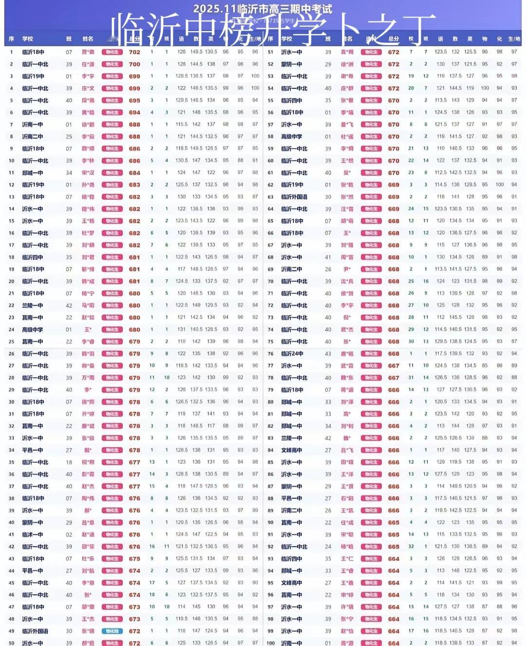 网传临沂这次高三期中考试排名前100名,看看哪个学校最多。这样的数据未必准确,仅作参考。从这个数据看,临沂十八中的确表现的确不俗,可是民间传言,这届高三十九中好像更好。图片来自网络,大家看着玩,不必当真。 1 临沂一中北 38 2 临沂18中 25 3 临沂19中 6 4 沂水一中 5 5 莒南一中 4 6 临沂四中 3 7 商城实验 3 8 高级中学 2 9 临沂二中 2 10 临沂一中本2 11 蒙阴一中 2 12 郯城一中 2 13 沂南一中 1 14 沂南二中 1 15 兰陵一中 1 16 临沭一中 1 17 临沂西城 1 总计 100。欢迎大家留言文明交流!