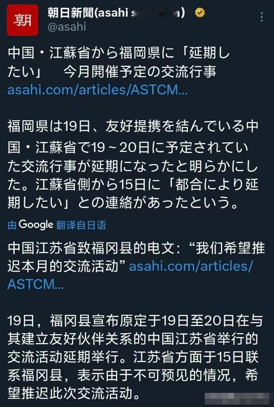 中日之间已经没有“友好”关系了 日本福冈县通过社交媒体宣布,中国江苏省向日本福冈县通报,由于不可预见的原因,推迟原定于11月19日至11月20在江苏省举办的交流活动 正常的地方交流都走不下去了,说明中日之间的“友好”只是表面功夫,滑到这一步,已经让人不得不问一句,这俩国家之间,还剩什么? 福冈和江苏其实早就是老朋友了,两地结好不止十年,过去也频繁互动。比如2022年还顺利办了一场环保合作论坛,气氛也算体面。可这次突然通知延期,明显不是“临时有事”。 过去两年,日本在不少问题上频频试探中方的底线。从芯片出口限制,到台湾问题上的模糊立场,再到政客接连参拜靖国神社,这些事情摊开看,每一个都在“累加伤害”。 中日本就脆弱的政治互信,如今已经塌了一大块。所谓友好城市的交流,在这种氛围下,自然也就成了空中楼阁。 特别是日本近几年越来越紧跟美国的步伐,参与对华科技封锁,表现得比华盛顿还积极。日本出台了对14纳米以下芯片设备的出口限制,直接冲击了中日之间原本还算密切的高科技合作,日本就是在用商业牌打政治算盘,让中方“吃亏还要喊好”。 这股“口惠而实不至”的套路,中国人心里早就有数了。学生交流、学术合作都频频中断。看似是政治问题,其实已经渗透到日常生活的方方面面。 日媒趁机炒作,说中方未安排媒体拍摄,疑似“不合作”。这种说法,听上去像是借题发挥,实则是典型的“贼喊捉贼”。你一边配合美国卡我们脖子,一边又指望我们在文化交流场合上对你笑脸相迎。 中日之间经贸合作虽然表面上还在继续,数据也没太难看,但背后的气氛已经全变了味。不少人还在讲“政经分离”,说政治归政治,经济归经济。可现实是,政治信任的塌方,迟早会传导到经济层面。 中方这次的做法,是一次战略性调整,既然你不尊重我,那我也没必要继续维持表面上的“体面”,中方的警告其实很清楚了,你怎么对我,我就怎么回应。 过去十年,中国在处理周边外交上一直主张“与邻为善”,对日本也并非没有耐心。可是一再让步换来的,不是缓和,而是变本加厉。某种程度上,日本已经不再是一个“难沟通”的邻居,而是变成了一个“选择性失聪”的对手。 中美虽然对抗激烈,但彼此底线还是有的,美方想要谈判时,也知道该做出什么样的姿态。而日本这几年,光学着美国“硬”,却学不到美国“会谈”的那一套。最终的结果,就是被中方当成“不可沟通”的对象处理。 这次交流活动的推迟,实际上是中日关系自然演化的结果。不是谁突然翻脸,而是积怨已久,终于到了临界点。很显然,中方并不担心短期内的风波,更在意的是长期信任被破坏之后,合作还有没有继续的可能。 如果继续把对华关系当成一个可以随时切换的开关,一会儿拿来谈合作,一会儿拿来做筹码,那最终失去的,不只是合作机会,还有地区稳定的大局。中方不想翻旧账,但也不会再装糊涂。 中日关系的“友好”外壳已经撑不住现实的压力。过去那种靠官方口号维系的表面和平,如今正在一件件小事中瓦解。民间交流也好,经贸合作也罢,没有政治互信的支撑,最后都会变成无根之木。 如果日方继续在关键问题上耍花招,那下一次“推迟”就不止是地方交流,可能是产业链重组,是投资退场,是信任的彻底崩塌。到底是想要一段可控、可预期的邻里关系,还是继续在错误的路上加速狂奔。 参考资料: 共同网:福冈县与江苏省的交流活动延期