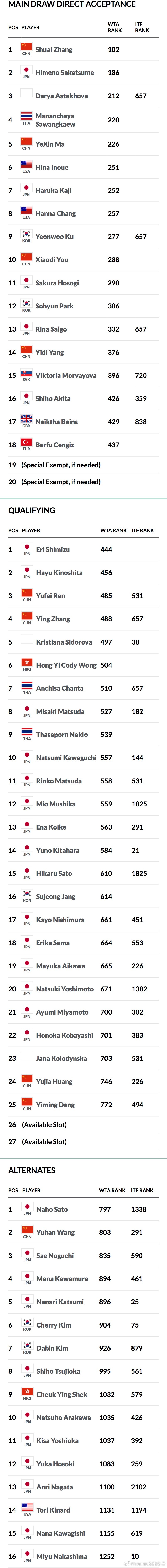 🔵W50横滨女单参赛名单💃🏻正赛:🇨🇳张帅、🇨🇳马烨欣、🇨🇳尤晓迪、🇨🇳杨一迪💃🏻资格赛:🇨🇳任钰菲、🇨🇳张莹、🇨🇳黄裕迦、党一鸣 丨