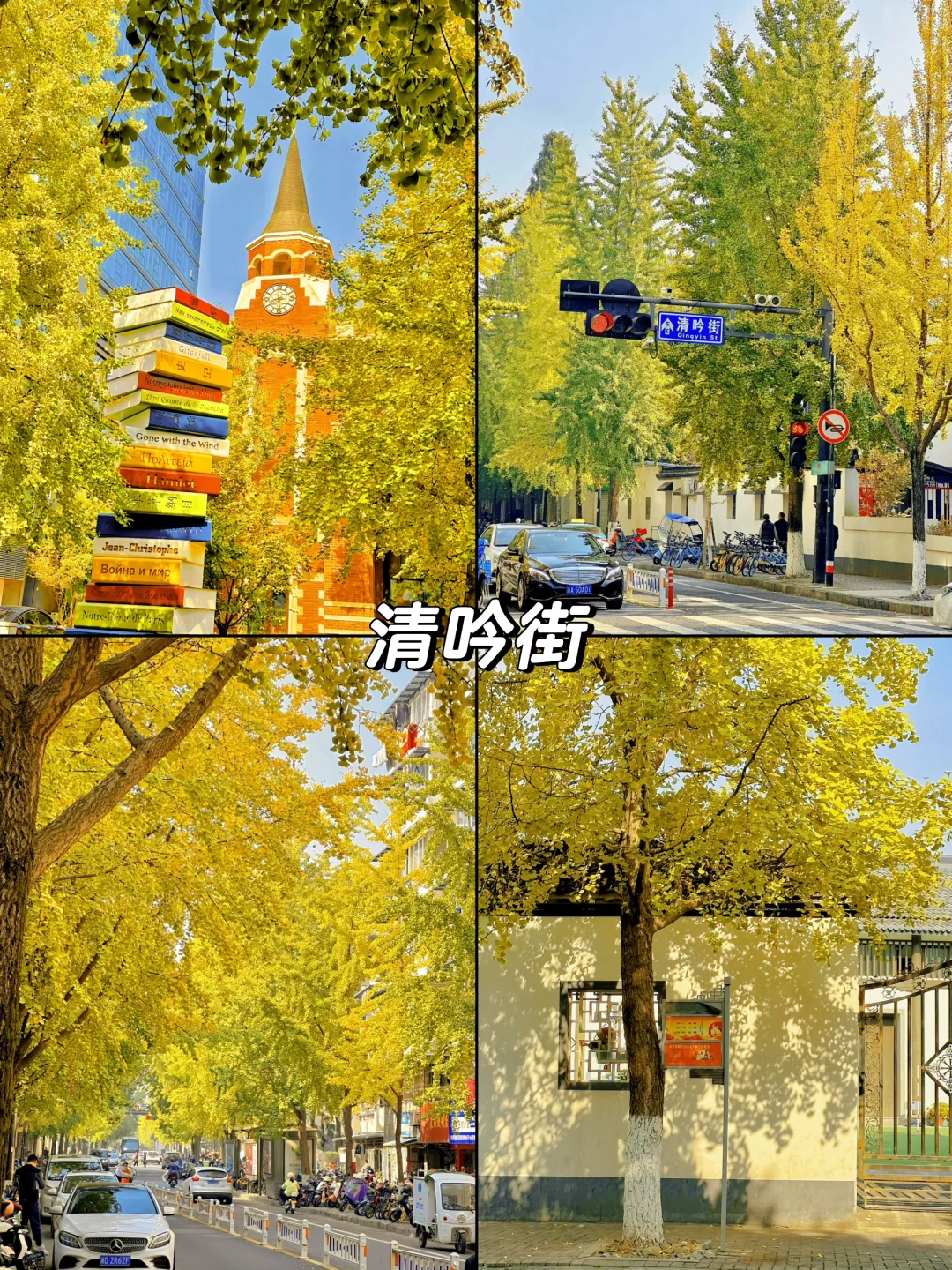 1️⃣清吟街:街道两旁都是银杏树,秋天在这里散步很浪漫松弛,新世纪外国语学校门口的机位很出片!