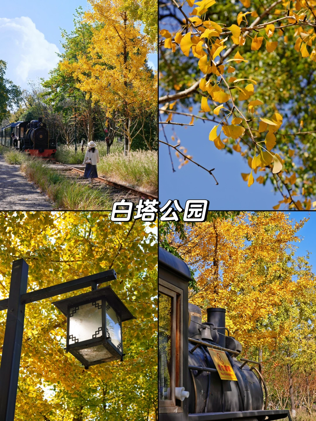 1️⃣0️⃣白塔公园:绿皮火车🚞和银杏适配度100%。沿着铁轨漫步,感受浓浓的秋意。