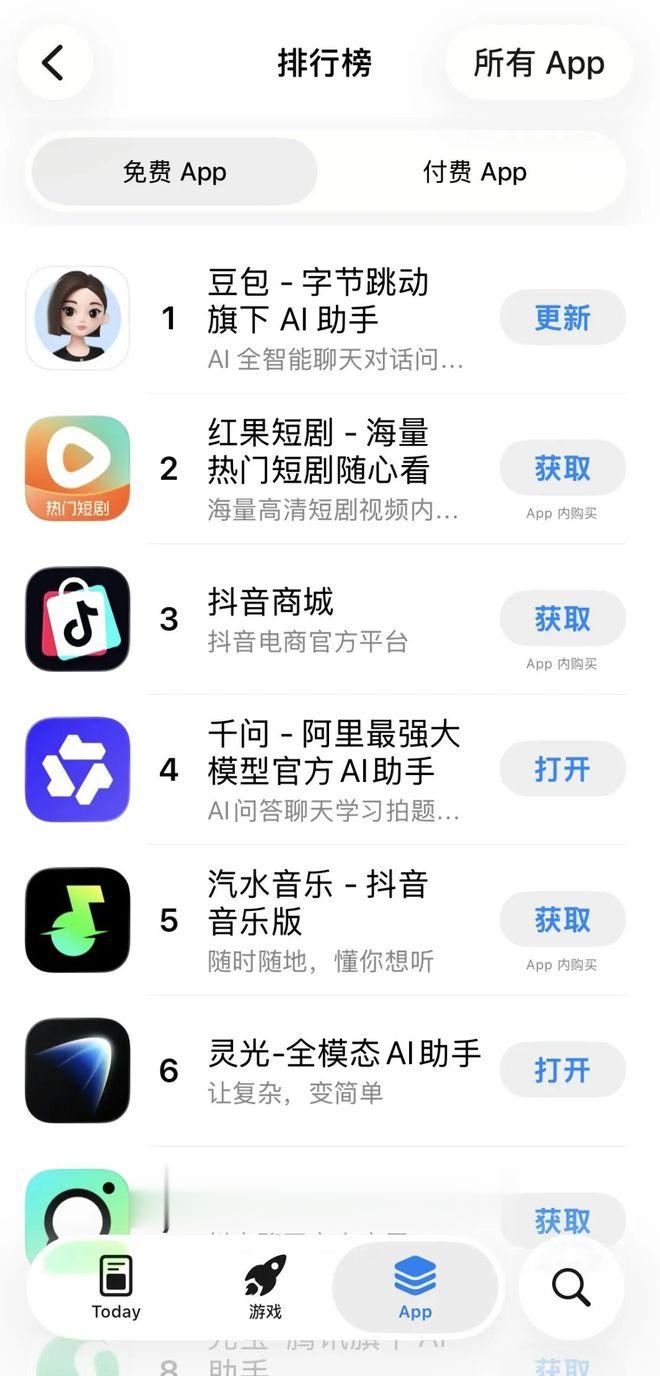 至此,阿里系两大AItoC应用(阿里千问、蚂蚁灵光)占据总榜Top6两席,为长期由字节跳动系产品领跑的AppStore免费榜注入了新的竞争变量。