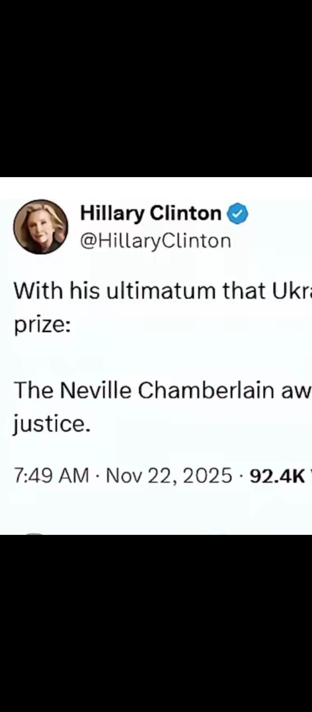 希拉里(美前国务卿)发的帖子,点出特朗普的“核心问题”,帖子称:特朗普向乌克兰发出对俄投降的最后通牒,会帮助他赢得张伯伦奖,以表彰他背叛和平、自由和正义。 张伯伦是二战初期英国首相,张伯伦(投降派的代名词)[捂脸] 有媒体报道称,特朗普的“俄乌谈判28”的所谓协议,现在就连美国共和党议员都提出质疑,美国民主、共和两党的议员,多质疑特朗普的“28条”,居心何在!乌克兰大概率不会接受!欧盟国家不会接受!美 ;国会议员大多数不会接受! (个人观点仅供参考)