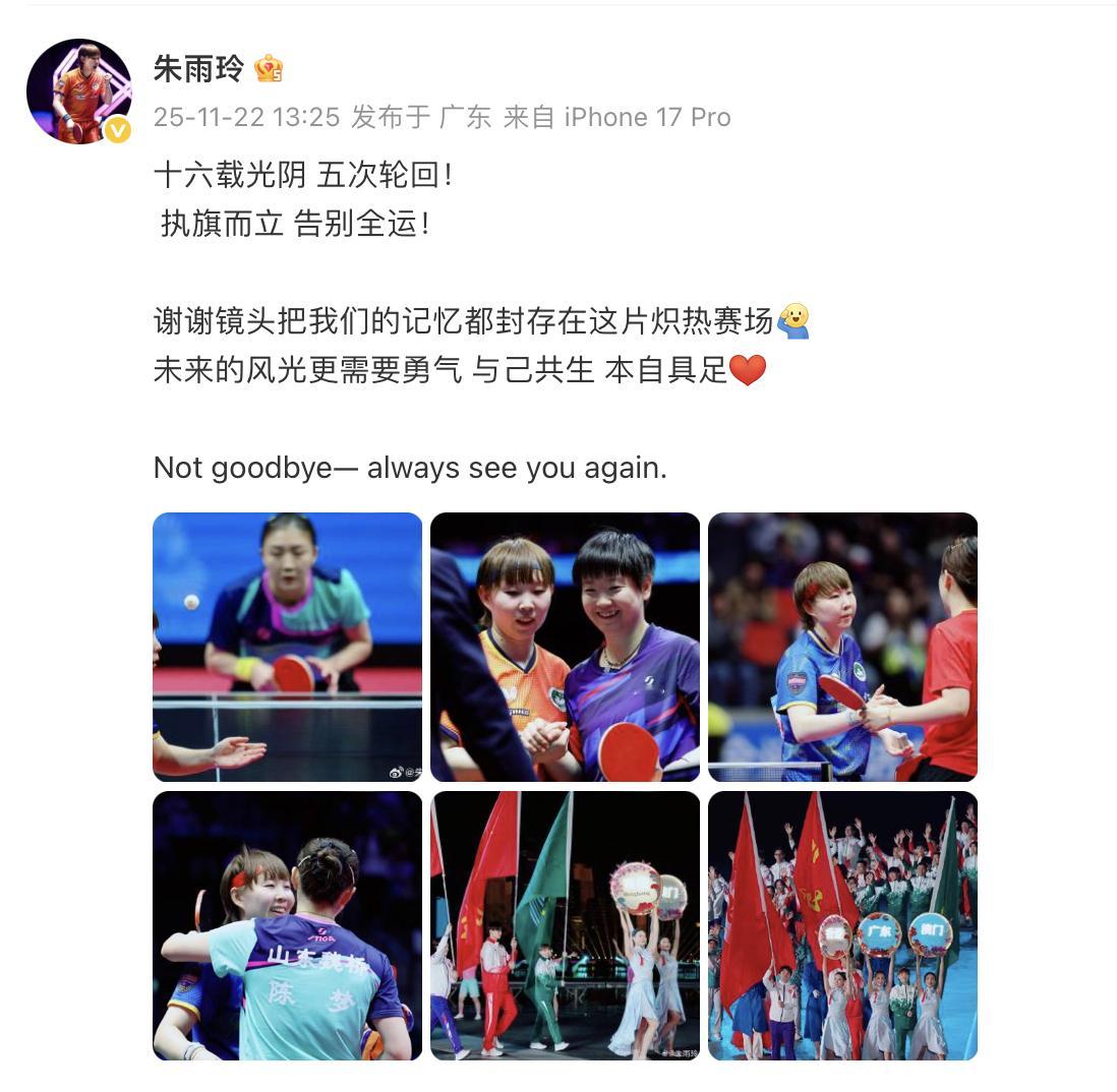 全运会后发博:“十六载光阴 五次轮回!执旗而立 告别全运!谢谢镜头把我们的记忆都封存在这片炽热赛场未来的风光更需要勇气 与己共生 本自具足Not goodbye— always see you again. ”