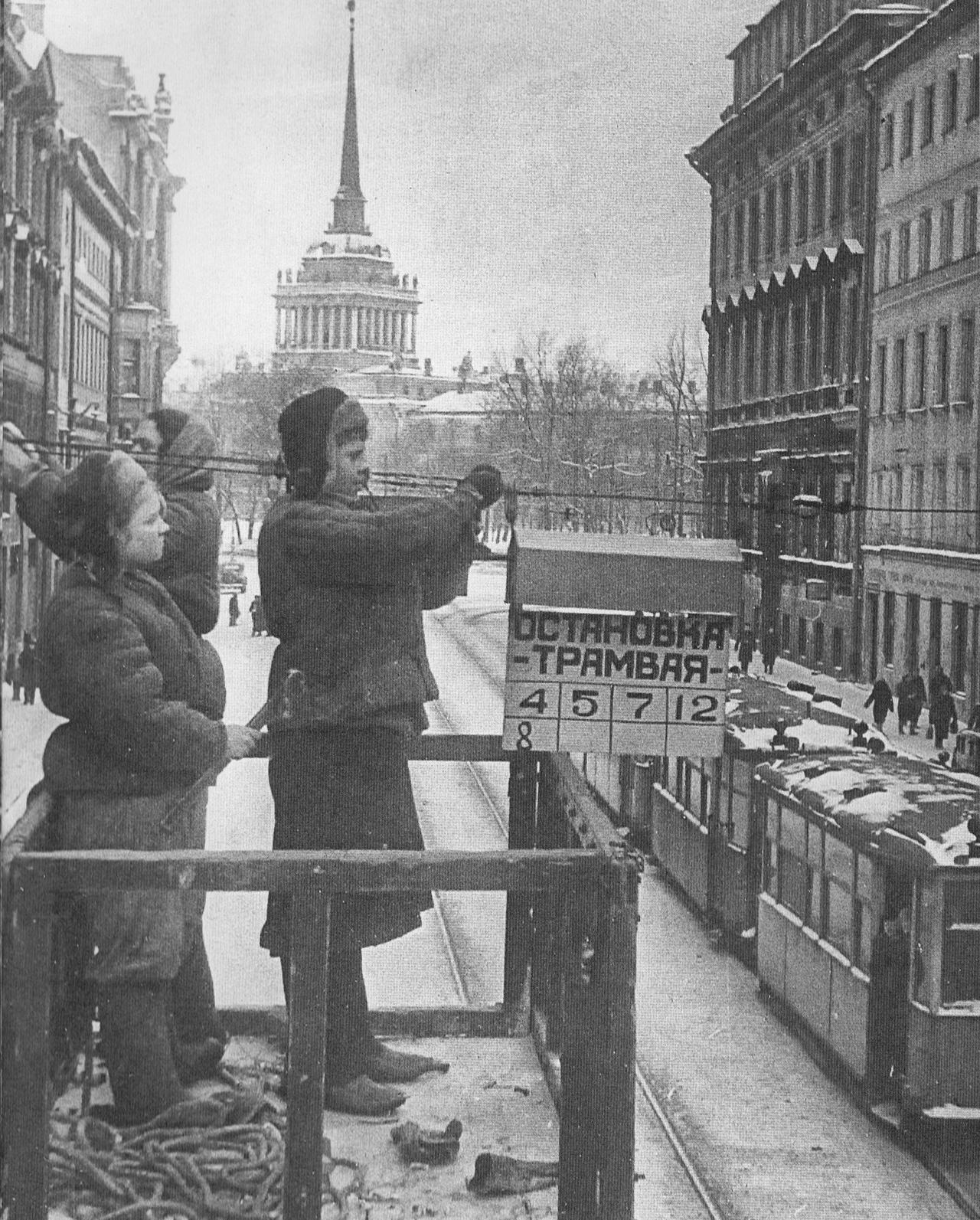 打跑了鬼子,重建家园——1944年,列宁格勒,涅瓦大街。工人们正在安装电车车站标志。 列宁格勒电车系统是欧洲最古老的电车网络之一,在872天围城期间保持了部分线路运行,1944年春季解除封锁后全面启动修复工程。 当时,列宁格勒开始系统性重建,优先恢复供电、供水和公共交通,涅瓦大街的电车于1944年4月15日重新通车。 大家注意:背景应该是著名的海军部大楼(参见图2)。