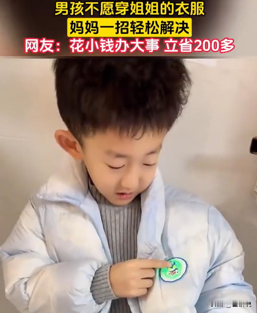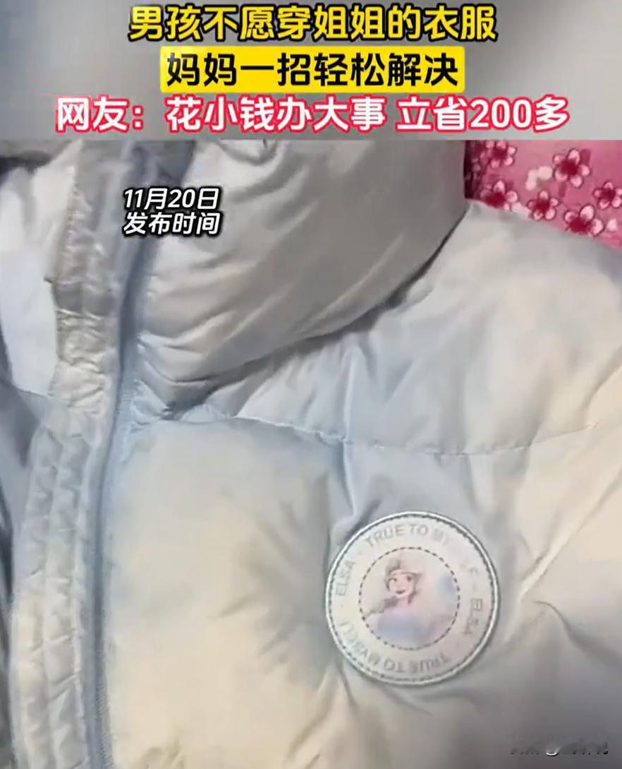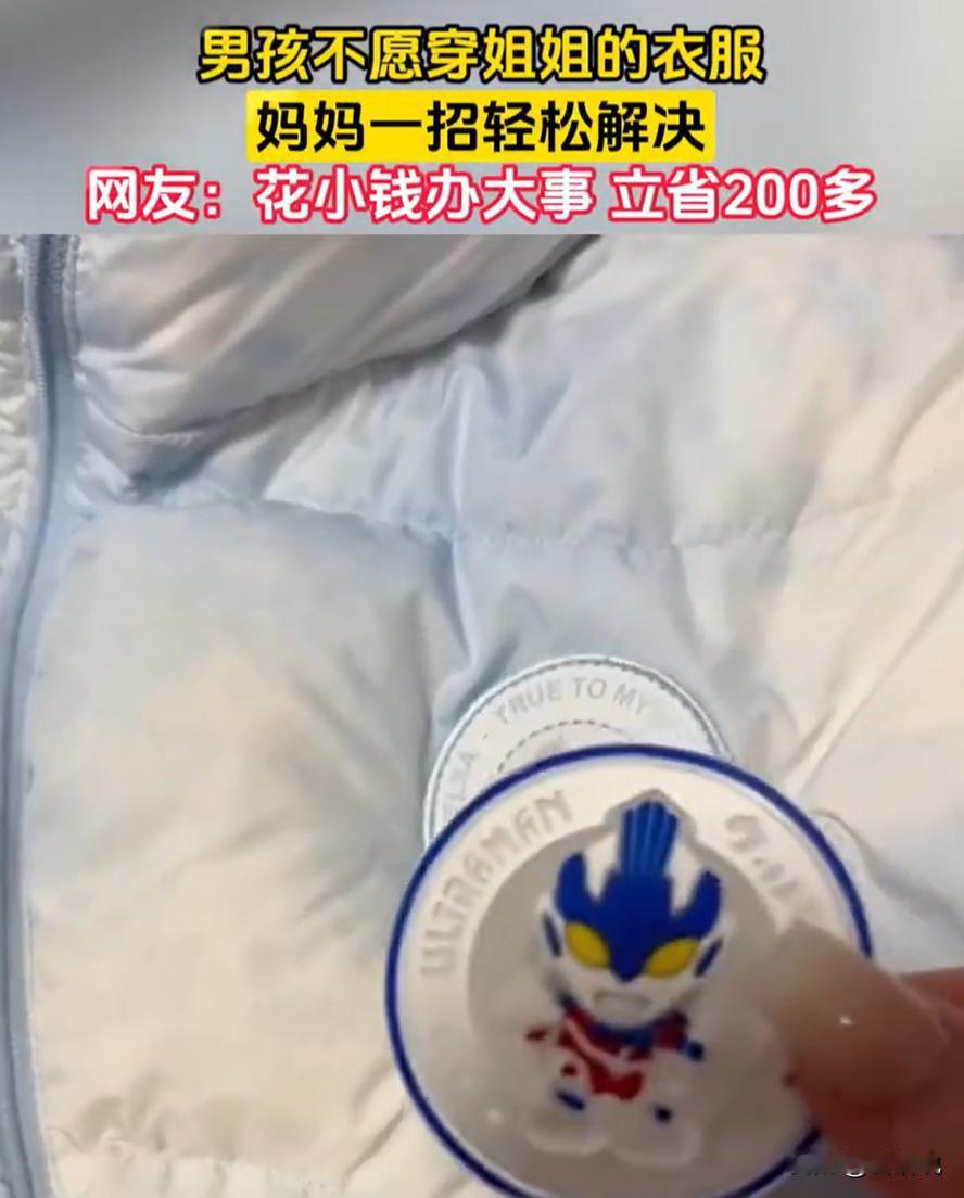 花小钱办大事!一位妈妈想要把姐姐的棉袄给弟弟穿,可弟弟看到棉袄上艾莎公主的卡通图案后却一百个不乐意,妈妈灵机一动,在网上花5块钱买了个奥特曼图标,这下弟弟不让他穿都不高兴了 孩子妈妈介绍,当天在家里收拾屋子时,找到了大女儿这个白色棉袄,这件棉袄当初买的时候正流行,上面绣着女孩子都喜欢的艾莎公主图案。现在女儿长高了穿不下,妈妈看着衣服还崭新,丢了实在可惜,正好可以给儿子穿 可问题来了,虽然棉袄大小正合适,但小儿子一看到艾莎公主的卡通图案,立刻摇头拒绝。小男孩觉得这是女孩子穿的,说什么也不肯穿。妈妈拿着这件棉袄左右为难,扔了浪费,留着又没人穿 妈妈开始动脑筋,拿着棉袄比划长短,把图案的位置量好,又跑去网上搜了一圈,最终用五块钱买了一个奥特曼图标。那图标大小刚好能盖住原图,还带点亮灯的小机关 当天一贴上去,弟弟眼睛立马亮了,捧着衣服那叫一个开心,穿上还要按几遍看灯闪不闪,原本死活不穿的棉袄,变成了他天天惦记的小宝贝 说实话,这个事看着挺有趣,可它背后是很多妈妈都懂的一种本事,叫顺着孩子的性子,把事办得漂亮 孩子并不讨厌旧衣服,他们讨厌的是觉得自己被忽略的感觉。五块钱不是重点,重点是妈妈把孩子放在心里,棉袄二次利用,家里不浪费 我觉得这种操作很值得点个赞。现在不少家庭条件都不差,可真正会过日子的家长,不是能买多少,而是懂得怎么让现有的东西发挥最大价值。孩子也会在这样的环境里慢慢懂得珍惜,明白物件换个思路就能继续用