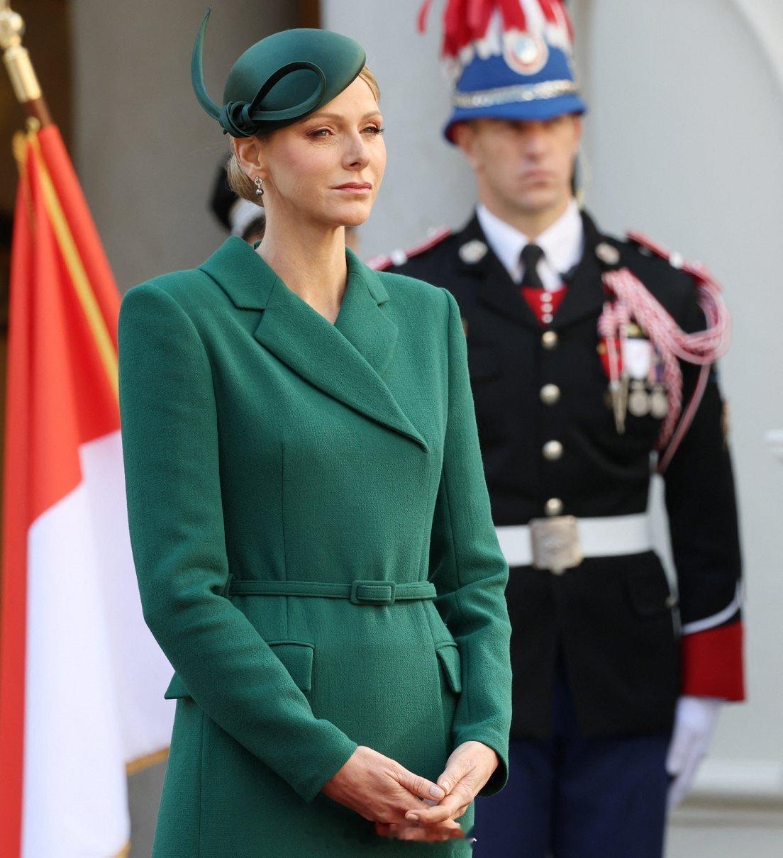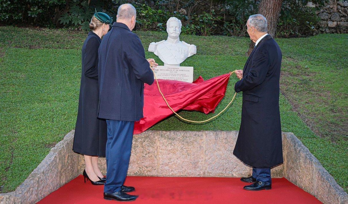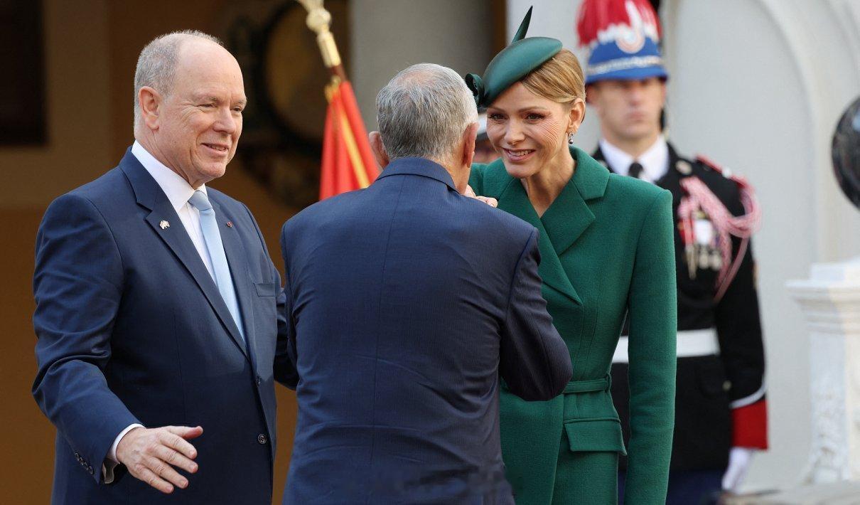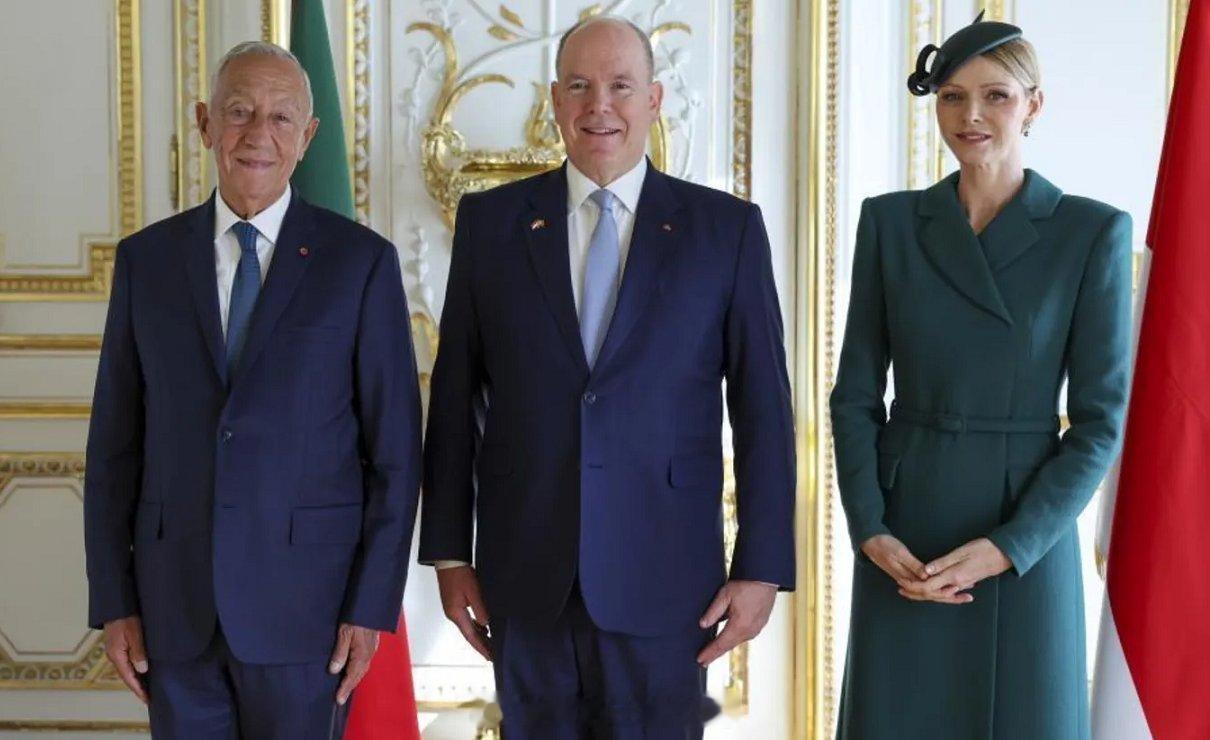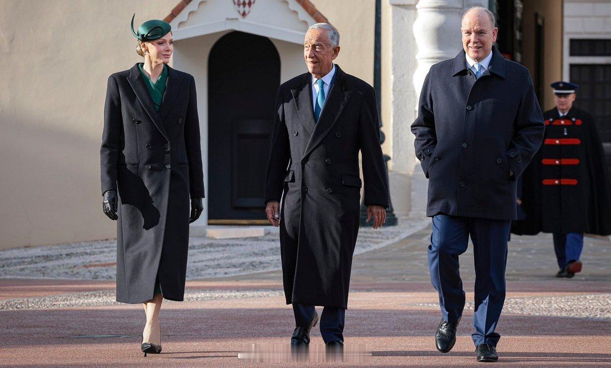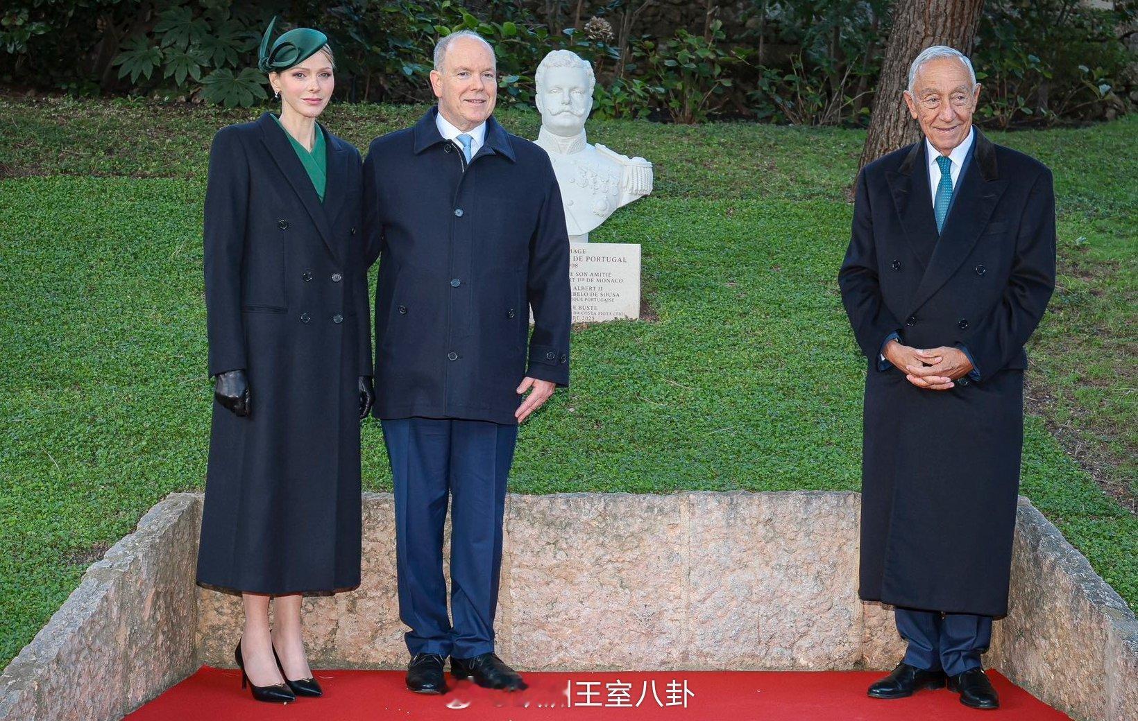 11.21 摩纳哥亲王阿尔贝二世和王妃夏琳接待来访的葡萄牙总统马塞洛·雷贝洛·德索萨,大爷连摩纳哥都溜达到了夏琳绿裙子来自Emilia Wickstead