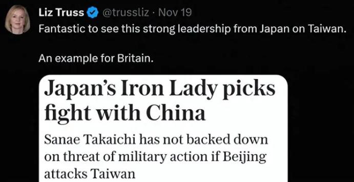 英国“最短命的首相”又来发声了!英国前首相特拉斯表示,看到日本在台湾问题上展现如