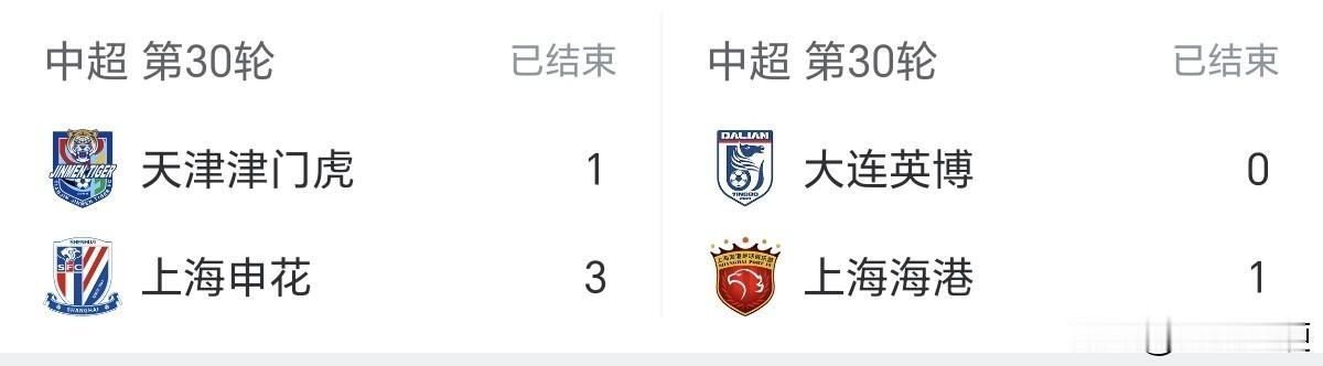 上海申花又白忙活一年!上海海港队终于完成三连冠🏆 北京时间11月22日15:35,中超联赛第30轮,八场比赛同时打响,本赛季中超联赛的冠军争夺进入百米冲刺阶段[奋斗] 落后一分的上海申花队,稳稳的3:0拿下天津津门虎队,坐等上海海港队犯错[哈欠] 但是上海海港队在客场挑战大连英博队的比赛中,开场第4分钟由外援加布里埃尔打入一球后,吃吃打不进第二球,让随队征战的球迷提心吊胆,好在大连英博队的攻击线属实不太行,也圆了上海海港队的三连冠梦想[泪奔] 不得不说,上海申花队这个赛季本来真是有希望拿下冠军,多次领先机会都被球队系数挥霍了,与其说是上海海港队夺冠,不如说是上海申花队太菜,关键的比赛拿不下来,谁也不能怪[哈欠]