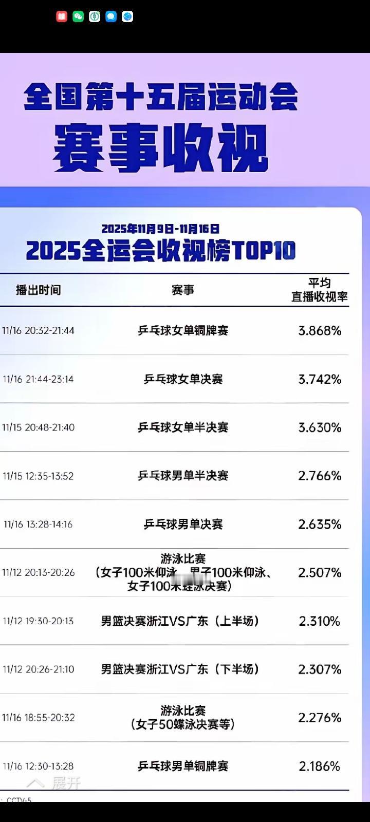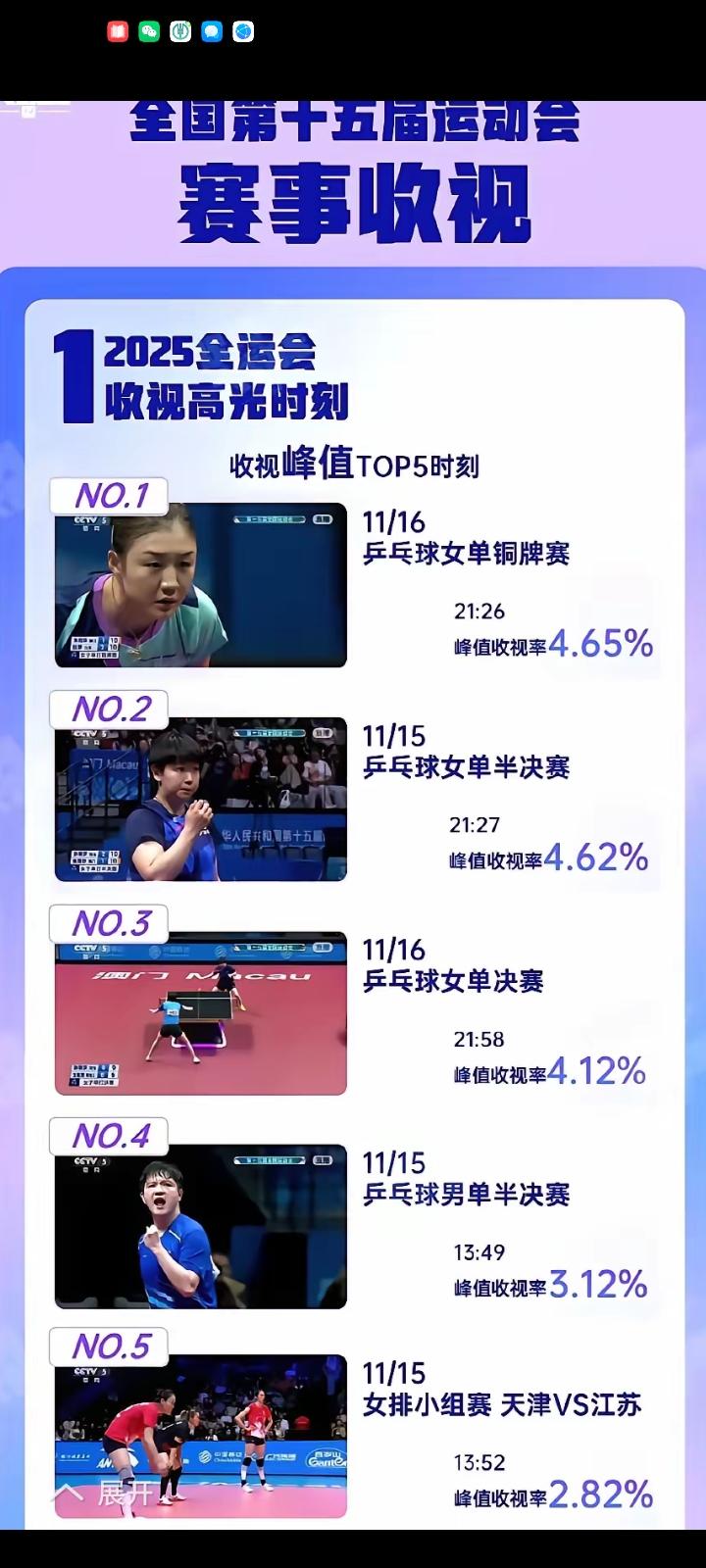 全运会收视率最高的项目是乒乓球,现场观众入座率最高的也是乒乓球项目。 收视率最高的比赛竟然是陈梦一朱雨玲的铜牌战 第二是孙颖莎一朱雨玲的半决赛 第三是孙颖莎一王曼昱的决赛 第四是樊振东一王楚钦的半决赛。 第五是女排江苏对天津的小组赛。 乒乓球虽然是小众项目,但是它力压力所有大项目,是目前国内商业价值最高的项目,也是市场化最成功的项目,这一点前乒协主席刘国梁功不可没[赞][赞][赞][赞]现在任国际乒联执行主席的他一定让乒乓球项目越来越好,成为世界的大项目。