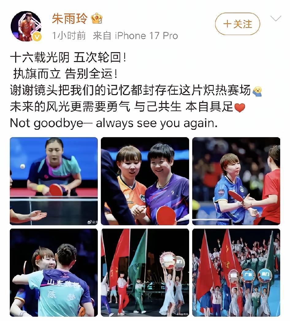 朱雨玲发的V博,言简言赅,寓意深长! 朱雨玲和大梦是同期球员,由于相处时间更长,感情很深,所以大梦的图片就有两张之多。 朱雨玲因为身体原因,退出又复出,充满了勇气,而且复出后成绩十分突出,那是对乒乓的挚爱啊。 十六年来,朱雨玲经历了许许多多,里面的甘苦只有她自己最清楚。所以她说“未来的风光更需要勇气”。是啊,对经历了十六风风雨雨的朱雨玲而言,未来还需要足够多的勇气。 继续加油,朱雨玲,祝你未来平安喜乐、一切顺利!