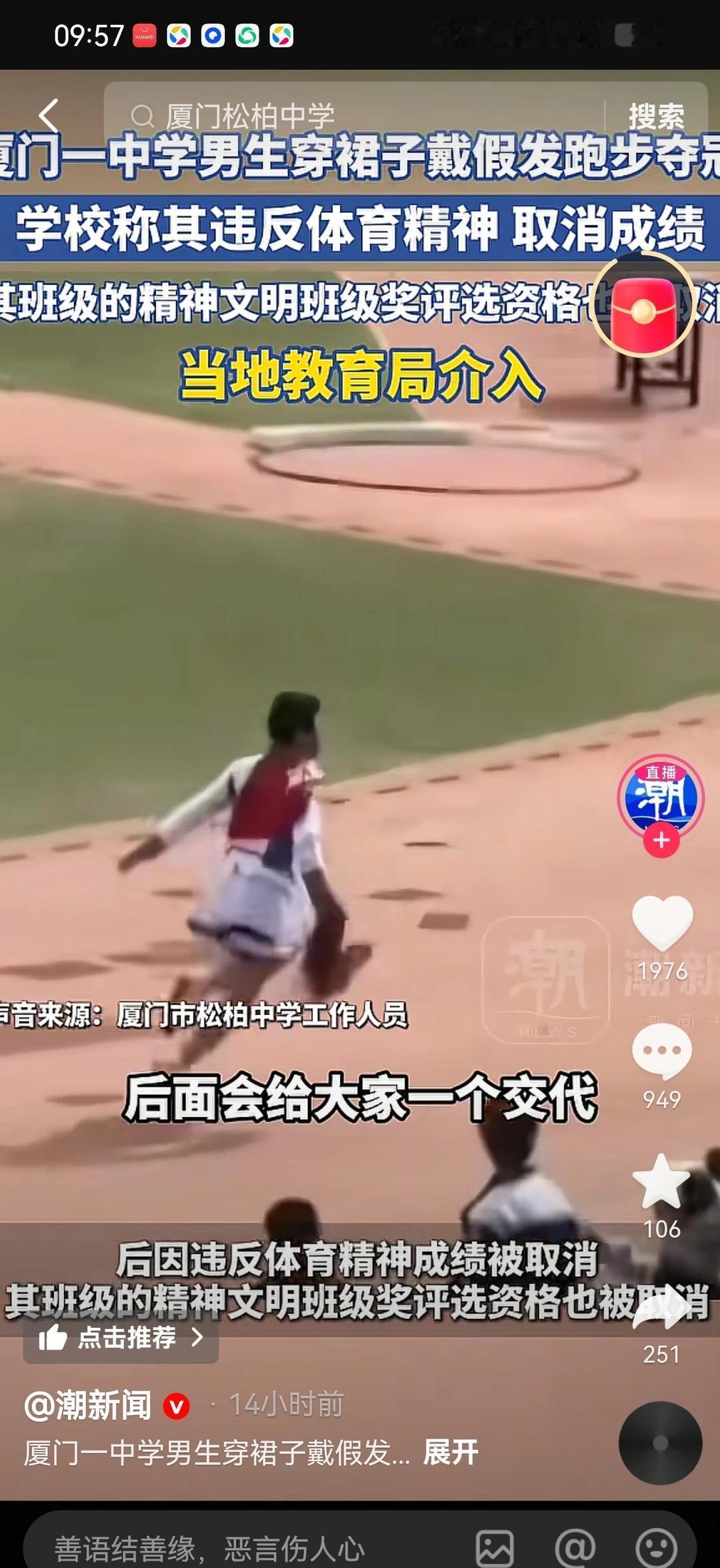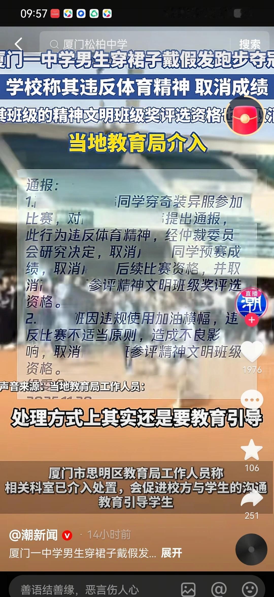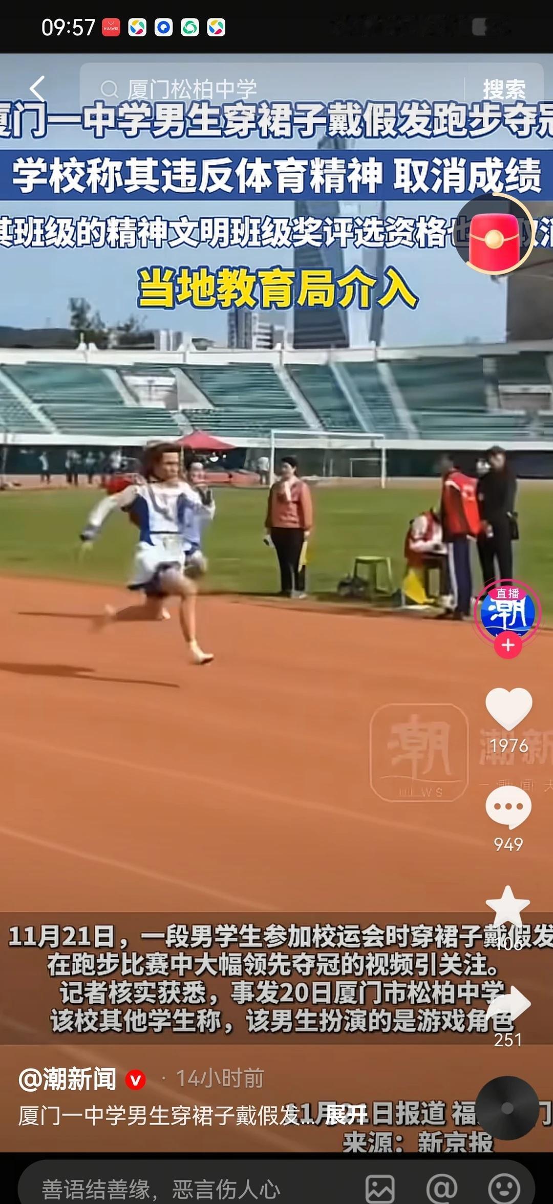 运动会获冠军被取消成绩,你怎么看? 男生穿裙戴假发跑步夺冠被取消成绩有人说孩子