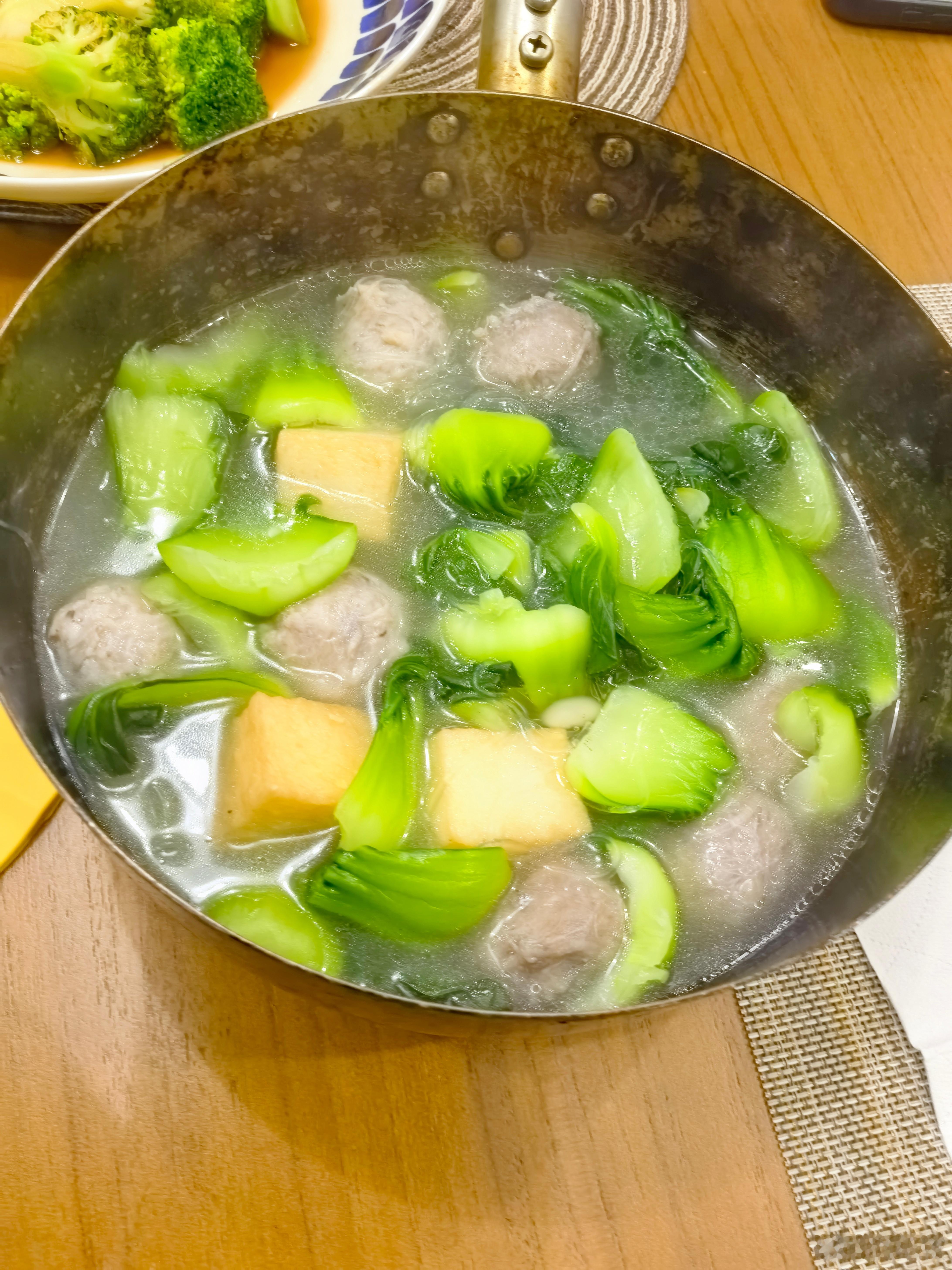 烤羊排,西兰花虾仁,青菜牛肉丸粉丝汤,蒸笋壳鱼。