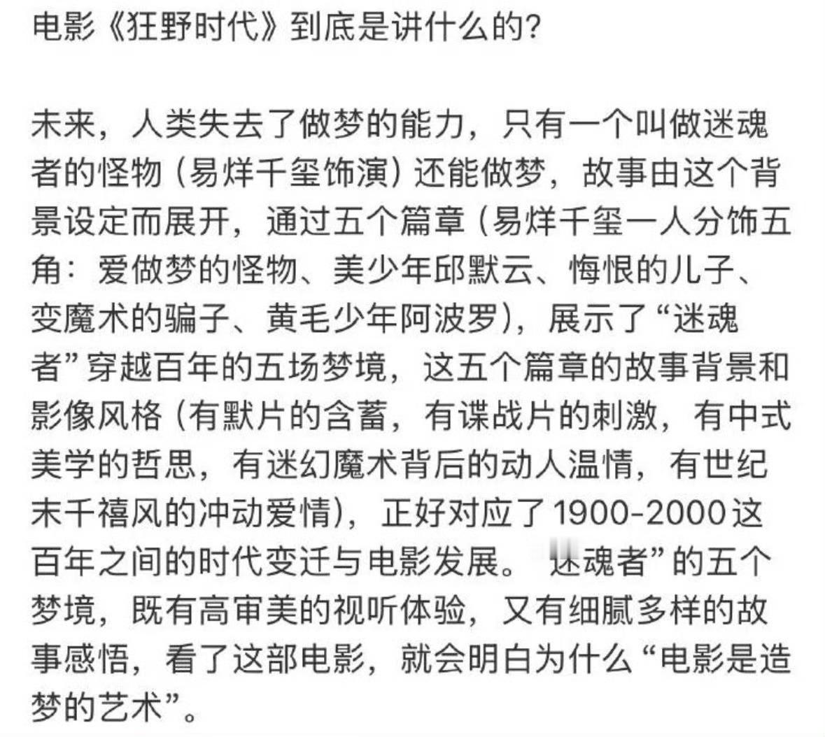 狂野时代 看不懂 其实可以不用尝试去理解它,不需要带有逻辑,像做梦一样就好了,感受美就行了!