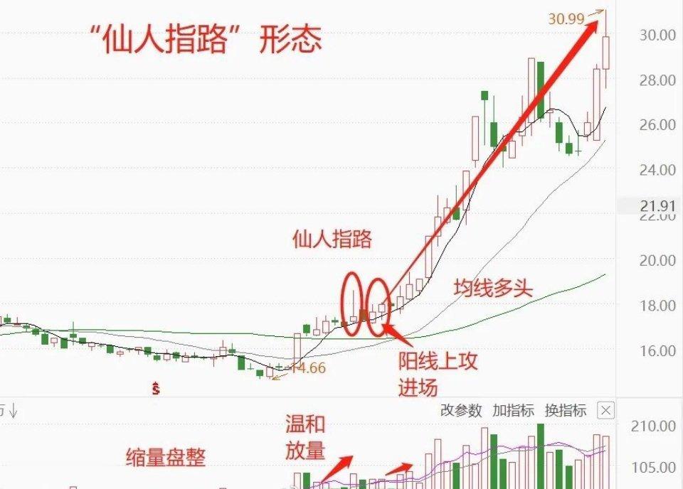 仙人指路K线信号:辨清走势,避开陷阱一旦K线走出“仙人指路”形态,即主力给出的方向信号,但多数散户盲目买卖,要么踏空大涨,要么陷入诱多陷阱。不会判断后续真实走势,建议看完本文,点赞收藏或评论“指路”,方便复盘查阅,下面直接拆解核心内容。先明确“仙人指路”本质:股价上涨途中,主力拉升后故意回落,留下实体短小、上影线为实体2倍以上的K线,核心是测试抛压、清洗浮筹。并非带长上影的K线都是仙人指路,关键看出现位置与成交量。一、强势延续走势:突破上影高点- 出现时机:上涨初期/中期,前期涨幅≤30%- 核心特征:仙人指路K线当日成交量温和放大(较前一日+30%-50%),无天量;次日高开高走,收盘突破上影高点,甚至放量涨停- 逻辑:上方抛压轻、跟风意愿强,主力直接加速拉升- 实操:突破当日小仓跟进,3日内不跌破突破价可加仓二、回踩确认走势:回调后创新高- 出现时机:横盘突破后/上涨中期(最常见)- 核心特征:K线后小幅回调(幅度≤5%),回踩10/20日均线缩量企稳,无大量散户出逃- 逻辑:存在少量抛压,主力回调洗筹,确认支撑后再拉升- 实操:关键均线缩量时低吸,跌破均线且放量则放弃三、假信号下跌走势:诱多后回落- 出现时机:高位区(前期涨幅≥50%)/主力出货阶段- 核心特征:K线当日放天量(较前一日+100%以上),上影极长、实体近跌停;次日低开低走跌破K线低点,成交量未缩- 逻辑:主力借形态诱骗接盘,实则暗中出货- 实操:高位天量形态直接减仓,规避山顶套牢风险四、判断关键:避开失误雷区散户判断失误多因两点:①忽视位置(高位大概率是陷阱);②不看成交量(无量、天量均需警惕)。同时需结合大盘:牛市/震荡市真信号概率高,熊市多为假信号。掌握以上3种核心走势与鉴别技巧,遇仙人指路形态可精准决策,避免盲目操作。