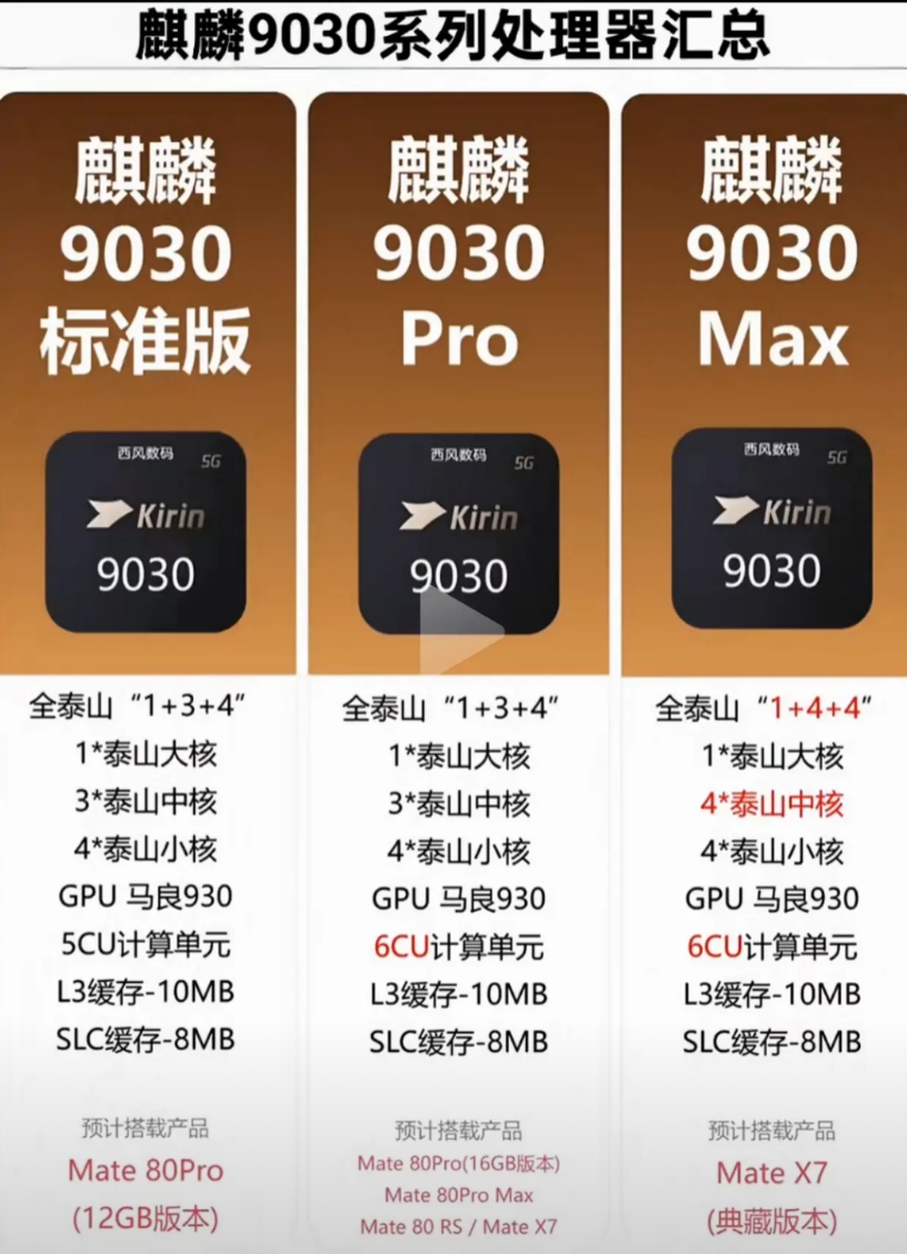 今年mate80系列和X7系列搭载的麒麟9030处理器分出几个版本来了… 有博主透露,目前麒麟9030处理器分为三个版本,分别是麒麟9030、麒麟9030Pro和麒麟9030ProMAX。 麒麟9030Pro对比麒麟9020性能提升了30%左右,麒麟9030ProMAX对比麒麟9020性能则提升了40%左右,那就是这三个版本基本是性能相差10%左右。 在日常使用中,体验不到什么差距的,但是功耗估计有差异,可以参考mate70Pro和mate70Pro优享版。