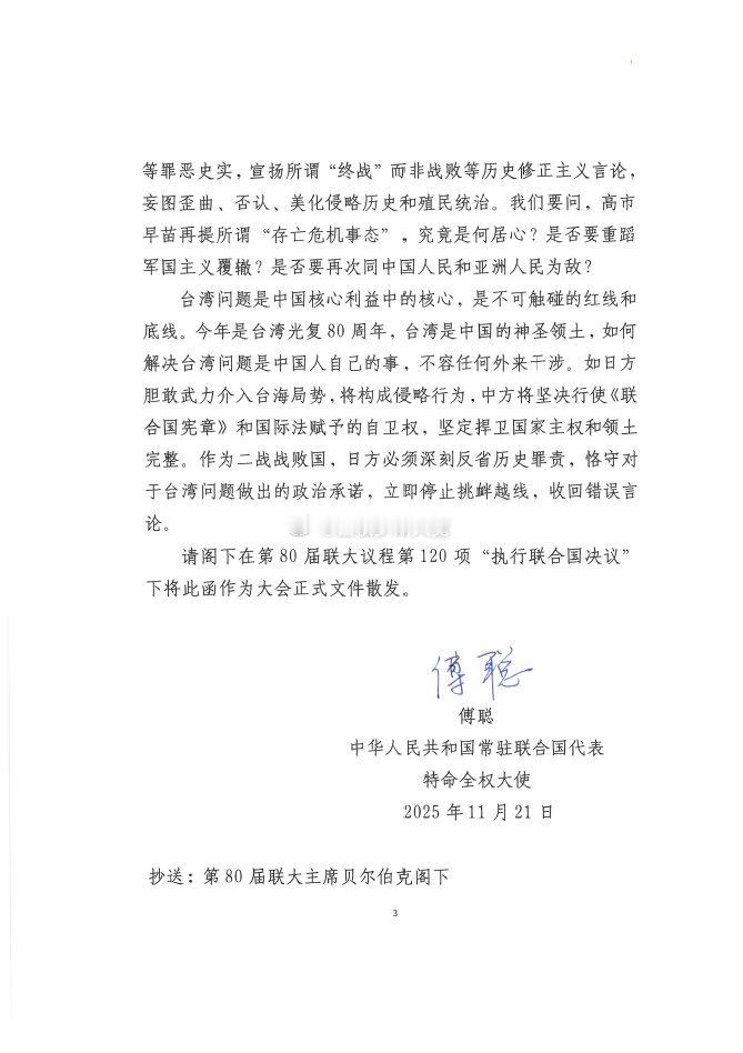 11月21日,中国常驻联合国代表傅聪致函联合国秘书长古特雷斯,就日本首相高市早苗涉华错误言行阐明中国政府立场。该函将作为联合国大会正式文件,向全体会员国散发。“若日方胆敢武力介入台海,将构成侵略,中方将坚决行使《联合国宪章》和国际法赋予的自卫权!”