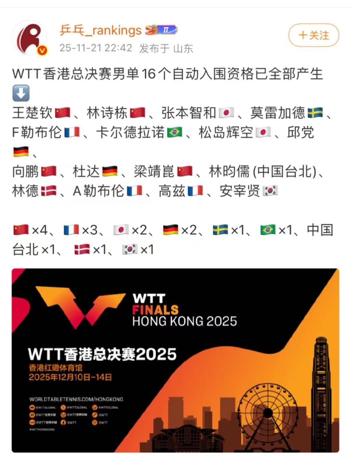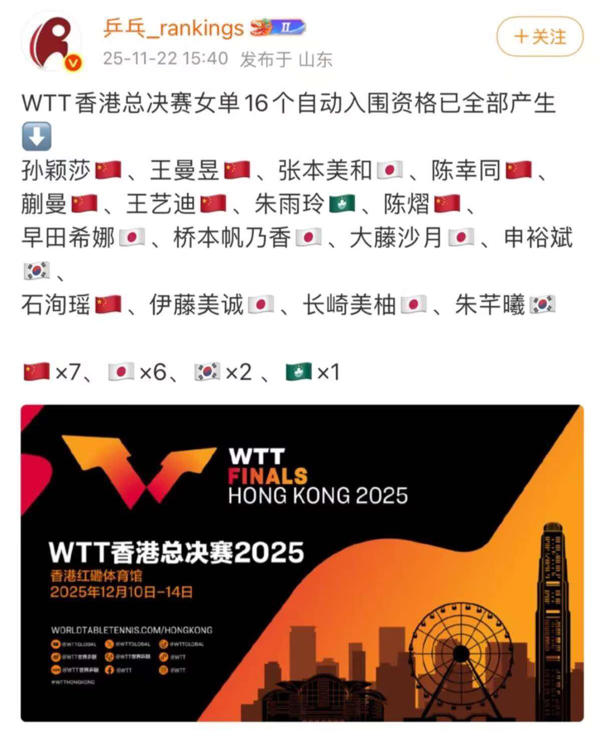香港总决赛名单已经确定,女队还是中日韩,男队百花齐放。 成都混团11月30日开赛,比赛结束之后, 要立刻前往香港参加总决赛。 香港总决赛的名单已经出来了, 男女队各16人参赛, 女队还是中日韩的对决,中国队就有7人参加,日本队6人。 都是熟悉的名字。 男队比较分散,也都很强大,日本只有两名, 韩国一名。 中国队加油!