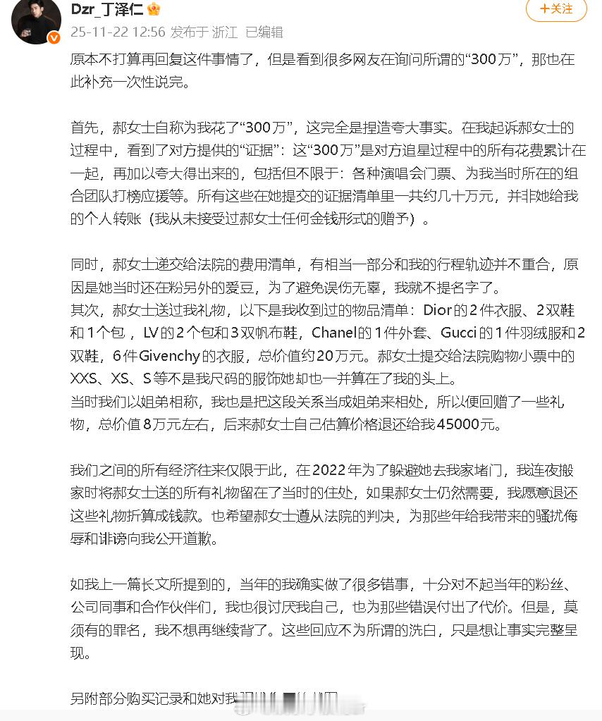 丁泽仁再发文回应“唯一的姐”相关,否认对方为他花了300万。