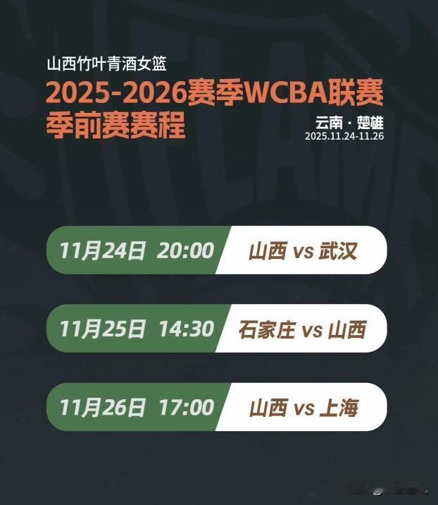 抵达赛区,准备战斗!山西竹叶青酒女篮全体将士抵达云南进入季前赛区! 不知不觉,新赛季WCBA联赛将至。为了备战新赛季,中国篮协麾下的WCBA联赛将于11月24日-11月26日,在云南楚雄举办季前赛。全新的山西竹叶青酒女篮已经平安抵达楚雄赛区,明天将正式进行踩场训练。季前赛共有三场比赛!分别是11月24日20时对阵武汉女篮,25日14:30时对阵石家庄女篮,26日17时对阵上海女篮。对阵石家庄女篮有看头,王丽丽携前山西女篮内线球员王梓伊、前锋朱睿迎战山西竹叶青酒女篮,山西女篮内线球员刘帅反戈主帅展淑萍带领的旧主上海女篮。山西竹叶青酒女篮新赛季出征球员有:翟若云、陈玉婕、霍俊彤、张懿、宋柯欣、刘帅、刘贝、方敏、林育庭、高建军、公海燕、李海娜、张冰烨、张茹、张含。外援拉塞尔.梅德赛斯、布拉德福德、奎因-埃格博。