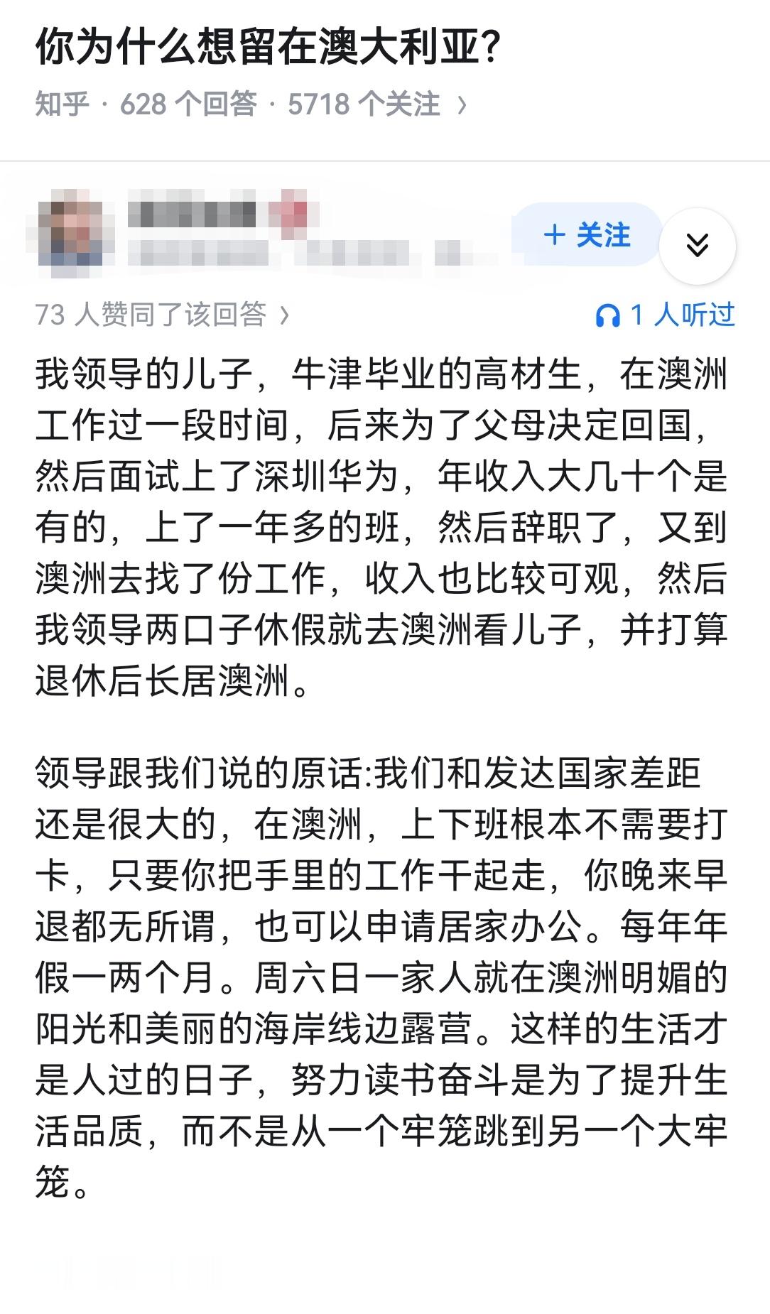 嗯,资源发达的澳大利亚有让国民悠闲惬意工作的资本,而其他发达国家就悲催了,中国不断在科技领域发力,蚕食老牌发达国家的经济领地,恐怖的是中国正不断加速由蚕食演变到鲸吞的程度,好日子不会太长了。