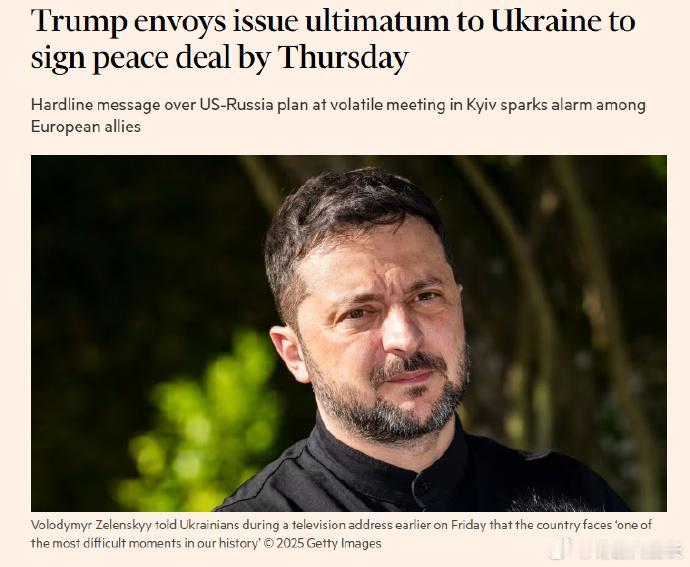 据媒体报道,美国正向乌克兰施压,要求其在周四前接受美俄和平方案。美国特使在基辅告诉欧洲外交官,谈判“几乎没有空间”,泽连斯基必须尽快签字。 在基辅一场紧张会议上,包括陆军部长丹尼尔·德里斯科尔在内的美方官员表示,乌克兰军事处境“非常糟糕”,现在是“实现和平的最佳时机”。 这一语气令欧洲大使震惊,他们担心该方案等同于向莫斯科投降。