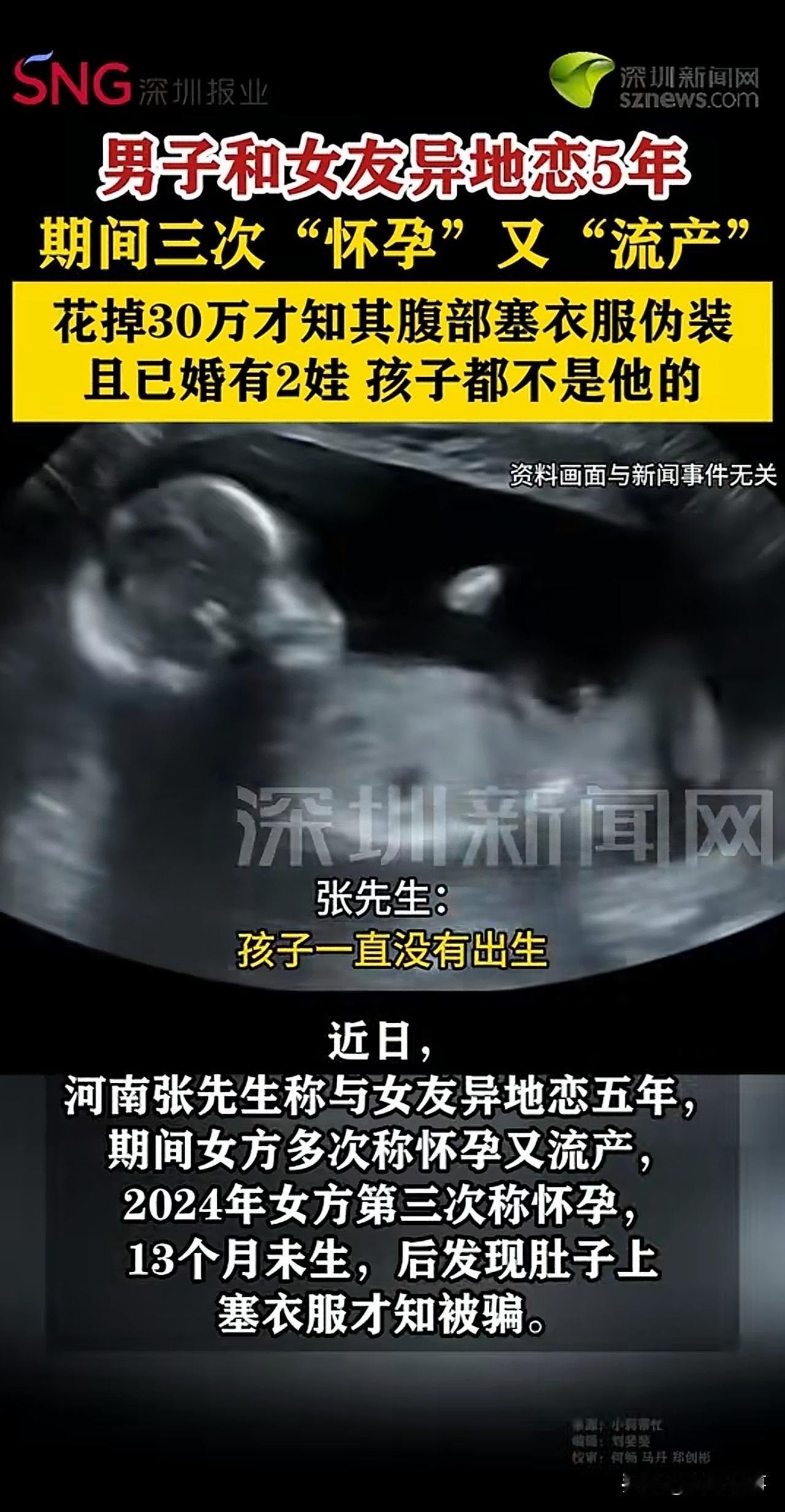 “五年真心喂了狗!”河南郑州,一男子每月挣2万全给女友。然而,女友三次怀孕竟全是假的,最后一次塞衣服装孕肚整整了骗了男子13个月。后男子报警才得知女友早就结婚并生了两个娃,五年内为她花掉的30万积蓄全打了水漂! “我一个月挣2万,自己就留点儿吃饭的钱,剩下的全给她了,谁能想到,五年的感情,从头到尾都是一场骗钱的把戏。”张先生说起自己的遭遇,语气里满是心酸和气愤。 2020年,张先生认识了一个女孩,俩人聊得投缘,没多久就处上了对象。 陷入热恋的他,对女友那叫一个上心,逛街买东西从不含糊,恨不得把最好的都给她。 2021年,女突然表示自己怀孕了,张先生可高兴坏了,二话不说包揽了她孕期所有开销,前前后后转了快4万元。 为了给孩子攒钱,他特意跑到外地打工,然而,就在女友怀孕七八个月的时候,对方却突然说孩子在肚子里缺氧,情况危急,但却死活不让他回家探望,也不告诉她具体的住址。 要说这事儿,换旁人早该起疑了,可当时满脑子都是女友和孩子的张先生,压根没往深处想。 之后俩人联系就越来越少,2022一整年都没见过面。 2023年初,女友突然主动找张先生,张先生看见了希望,立马从外地赶回郑州,俩人复合后还住到了一起。 可好日子没多长,女友又说自己怀孕了,结果没过多久,又以“宫外孕流掉了”为由,让他再次失望。 就算接连两次“失去孩子”,张先生还是没怀疑过女友,转头又去外地打工,心里就一个念头:好好赚钱养家。 2024年8月,女友第三次告诉他“怀孕了”,张先生以为这次总算能修成正果。 可谁能想到,从2024年8月到2025年10月,整整13个月过去了,孩子愣是没动静。 追问之下才发现,所谓的“孕肚”,竟然是塞了一堆衣服撑起来的! 面对质疑,女友又开始编瞎话,说孩子八九个月的时候夭折了,已经埋了。 这次,张先生不再犯傻,忍无可忍之下便报了警,在民警的帮忙下,他第一次见到了女友的父母,也听到了让他彻底崩溃的真相:女友早在2021年就结婚了,还生了两个孩子,最新的孩子在2025年8月份刚出生。 原来,女友这次怀孕是真的,但只是不想让张先生知道。通过亲子鉴定,也明明白白显示和他半毛钱血缘关系都没有。 五年时间,30万血汗钱,一颗掏心掏肺的真心,到最后全成了别人眼里的笑话。 不得不说,女方的行为实在让人恨的牙痒痒,这不是欺负老实人吗?而且,从法律上说,这已经不是什么“感情纠纷”了,女方已经涉嫌诈骗。 她在一开始就抱着非法占有的心思,靠着隐瞒已婚的事实、编怀孕的谎话、伪造医疗单据这些手段,骗走张先生的信任和金钱,涉案金额高达30万元,已经达到了诈骗罪里“数额巨大”的标准。 按照《刑法》第266条规定规定,诈骗数额巨大的,一般会判处3年以上10年以下有期徒刑,并处罚金。 当然,最后怎么判,要综合女方认不认罪、有没有把钱退回来等情况综合考虑。 现在对张先生来说,除了配合警方调查,追究女方的刑事责任,还应在收集证据通过打官司的方式,要求女方把骗走的钱还回来,尽量减少自己的损失。 感情的根基是真诚和信任。 不管是谈恋爱还是交朋友,都得保持理性和警惕,切勿因一被一时激情而冲昏头脑。尤其是涉及到大额钱物往来的时候,一定要斟酌再斟酌。 希望每个人谈恋爱的时候都能保持清醒,敢真心付出,也懂保护自己。 对此,你怎么看呢?欢迎大家在评论区留言。