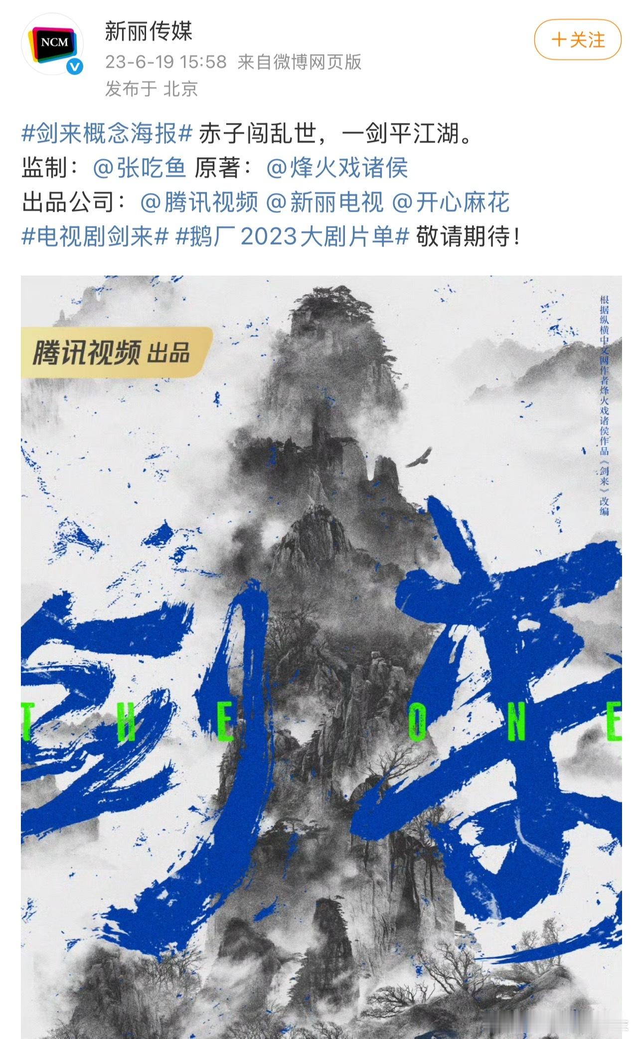 新丽电影➕开心麻花《剑来》吴磊、张震新丽电影➕开心麻花《谢家的短命鬼长命百岁了》刘亦菲、陈晓这是电影公司联姻给头部做剧了吧,看刚开始剑来是新丽电视做的,现在开机直接变成了新丽电影。短命鬼很大可能导演还是张吃鱼。