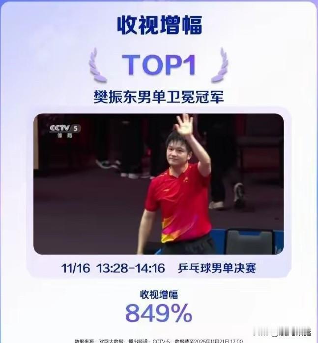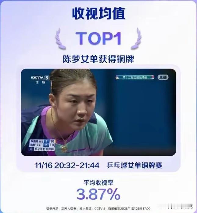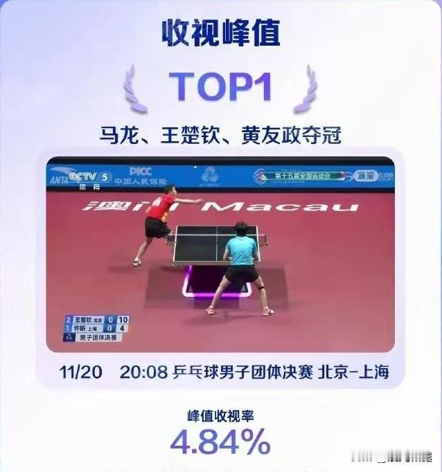 全运会乒乓球收视率 一、收视均值第一名:女单铜牌赛 二、收视峰值第一名:男团冠军赛 三、收视增幅第一名:男单冠军赛 陈梦与朱雨玲的女单第三名争夺战,平均收视率达到3.87%,能超过男女单打冠军争夺战,足见观众对两位国乒老队员的喜爱。 北京队同上海队的男子团体决赛中,峰值收视率达到4.84%,马龙王楚钦和樊振东许昕的对决,当属国际乒坛最顶级的比赛。 樊振东与林诗栋的男单冠军争夺战,收视增幅为849%,比赛时间为中午这个观众增幅值创造了一个纪录,足见樊振东的影响!