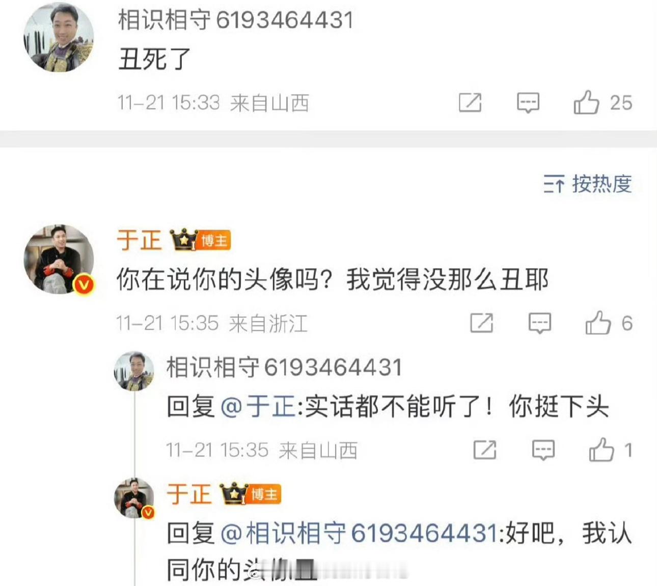 有人说于正丑,于正说:你在说你的头像吗?我认同你头像丑。这个网友头像原本是陈哲远,换成了于正自拍