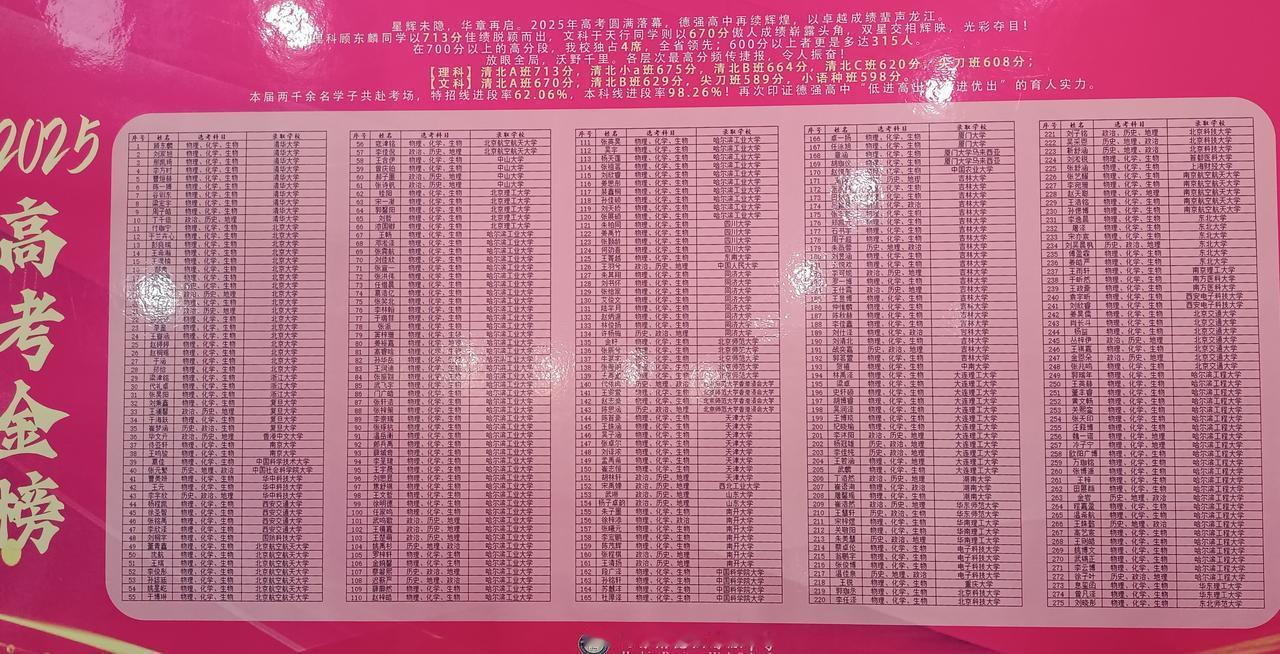德强高级中学2025年,高考成绩考上的学校。 清北A理科最好成绩713 清北小a理科最好成绩675 清北B理科最好成绩664 清北C理科最好成绩620 尖刀班理科最好成绩608 进特招线62.02%. 过一本线98.26% 中考清北A最低录取分数460 中考清北小A最低录取分数455 中考清北B最低录取分数449 中考清北C最低录取分数420 中考尖刀最低录取分数360 全校最低录取分数80 高考成绩和中考录取分数线比算不算低进高出。