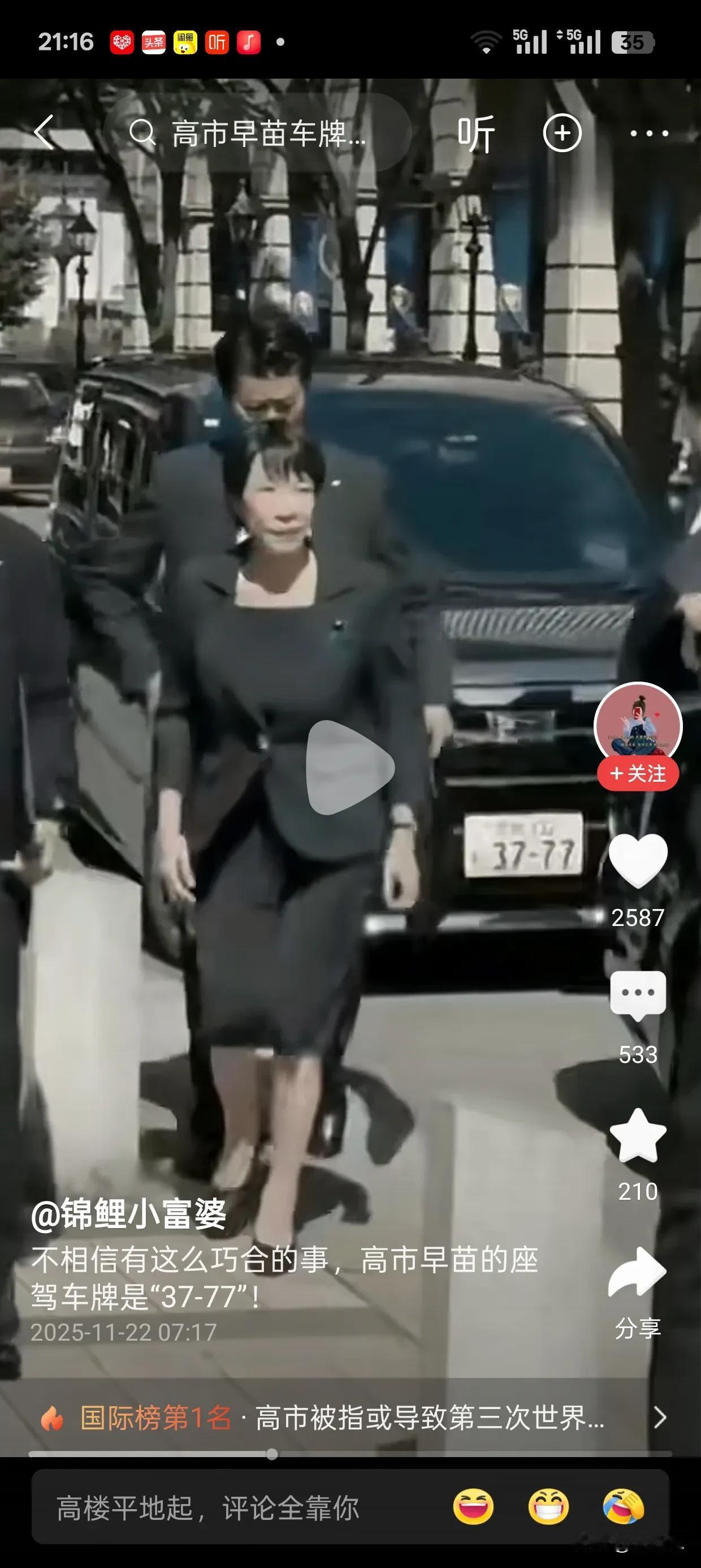 看到高市早苗的车牌,我感觉被羞辱了一次,37-77,这是巧合吗?小日子高层,没人知道1937年7月7日的事,你信吗?拿侵华日期当车牌,很显然,他想让日本正常化了,投降八十年了,他们觉得可以了,或者美国暗示他可以了!!!