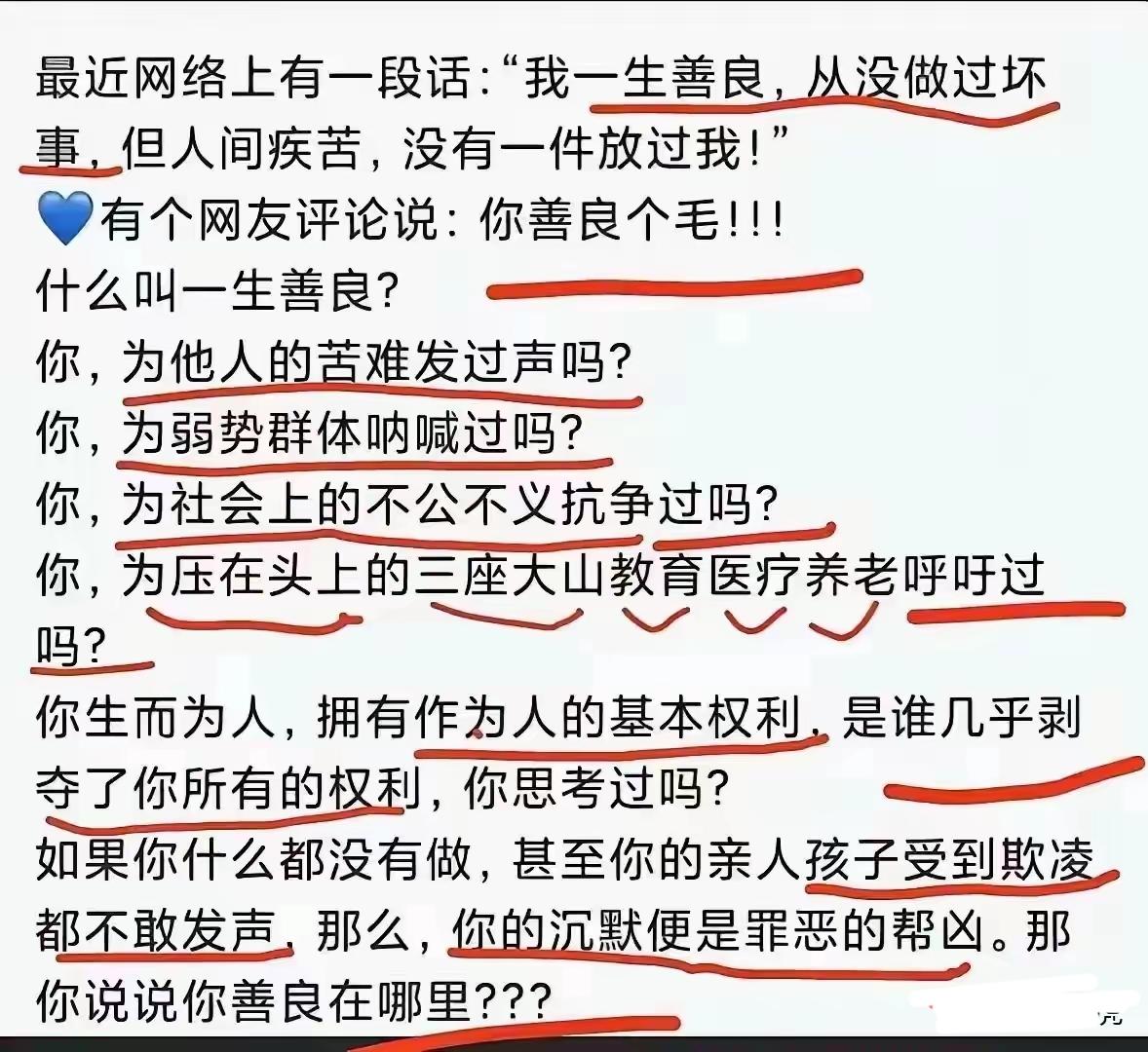 有人觉得人间不值得:“我一生善良,没做过坏事,可人间疾苦从没有放过我”; 更有人劈头盖脸:你善良个毛!你没有发声过,没有呐喊过,没有抗争过,没有呼吁过……你不善良。 不,不,不,只要不仗势欺人,不恃强凌弱,不故意伤害别人……就已经足够善良了,没多少人做得到。而抗争、呐喊、呼吁,甚至思考,这些叫勇敢,是绝大部分人做不到的美德,能做到的那一小部分,我们叫他们英雄。 做英雄,很难。