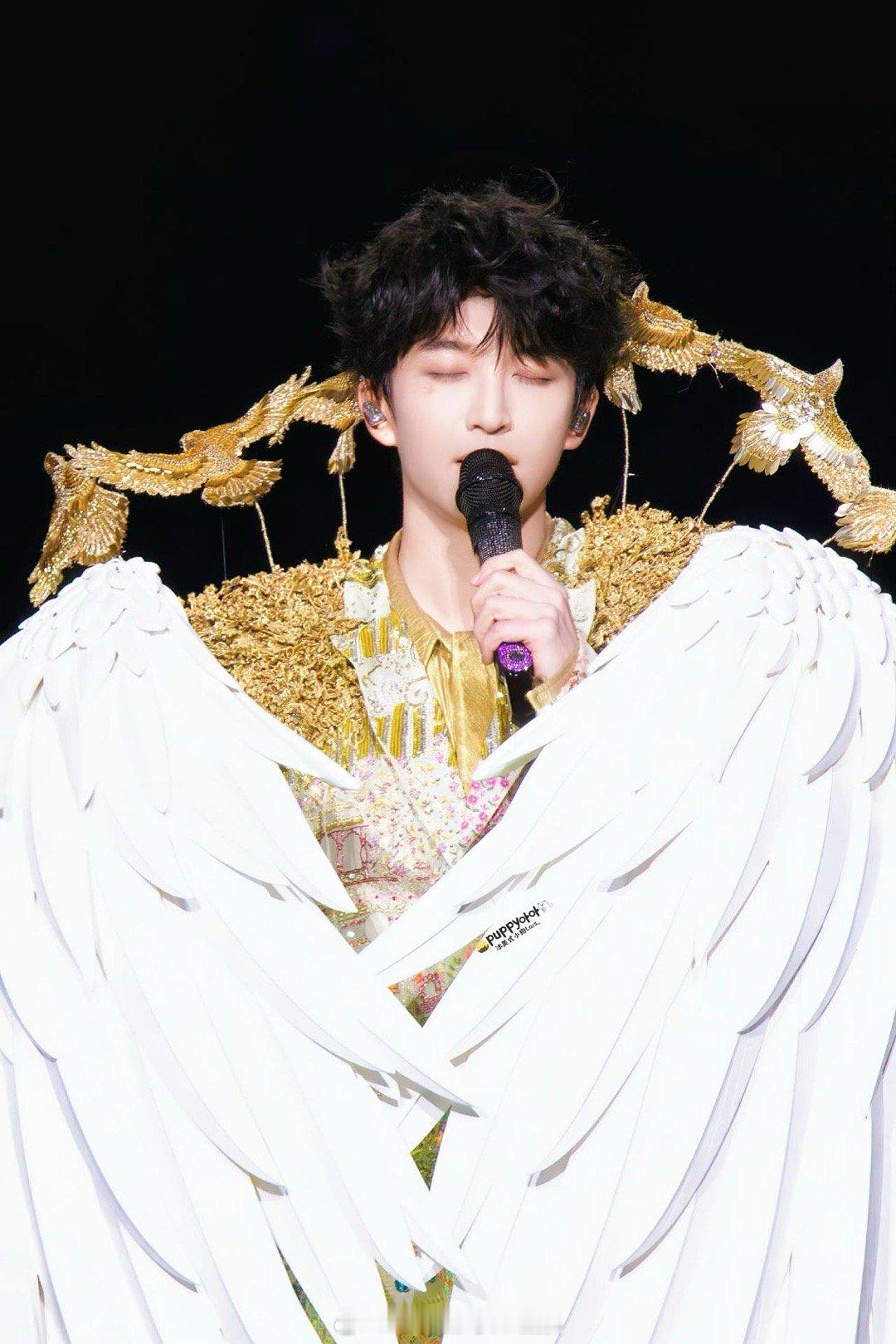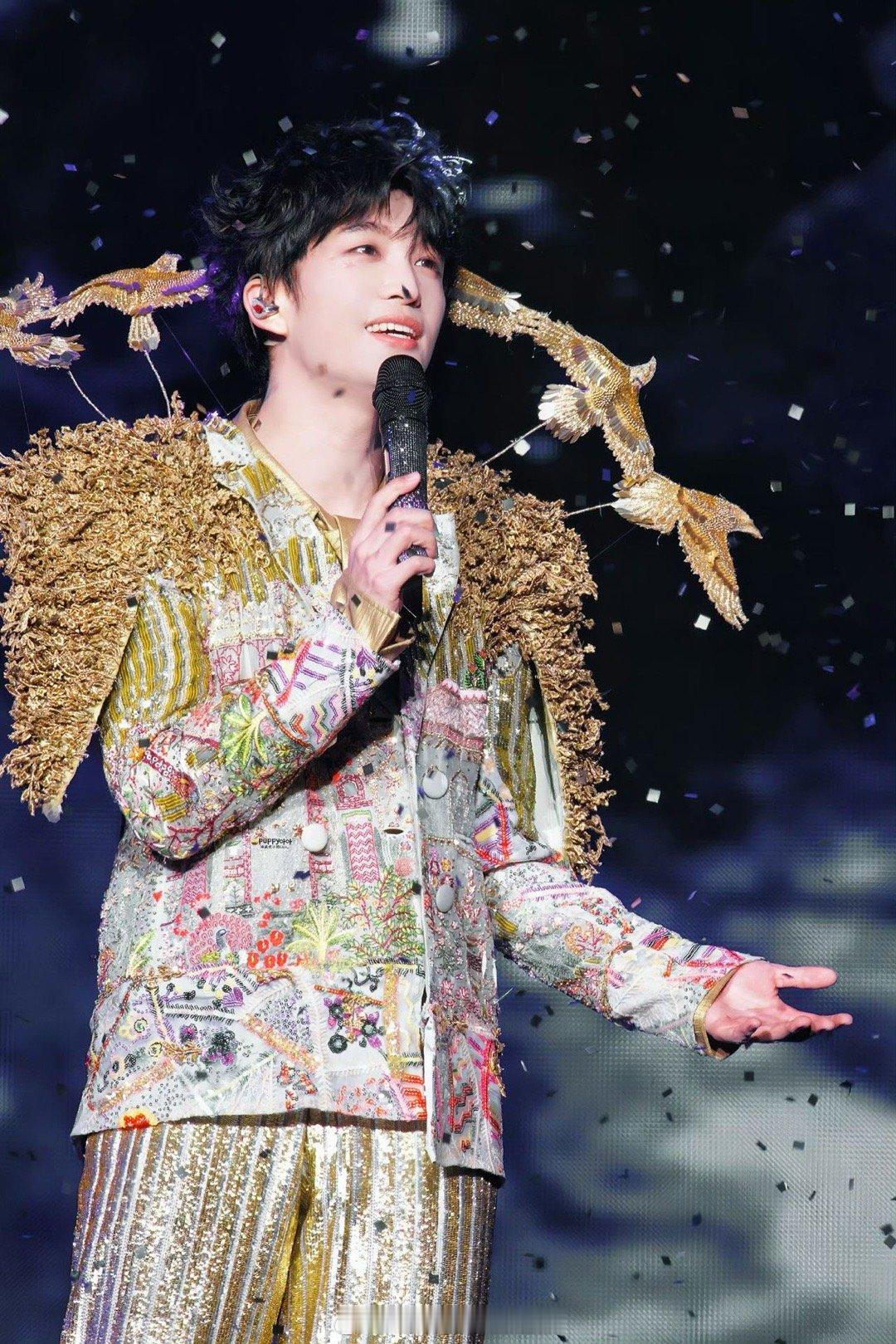 我的妈呀,黄子弘凡今天鲨疯啦!穿着Rahul Mishra定制的高定礼服亮相上海返场演唱会,鎏金碎光配上满绣花纹,还有精致翅膀,精灵王子就这么闪耀全场!