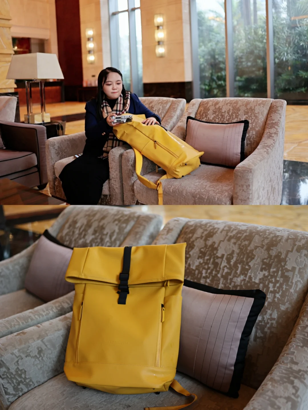 🌟走进酒店后放下日杂用品,带着相机,无人机和脚架出门拍摄。四种颜色中选择了更亮眼,拍照更上镜的姜黄色。拍照的时候还能做穿搭搭配。