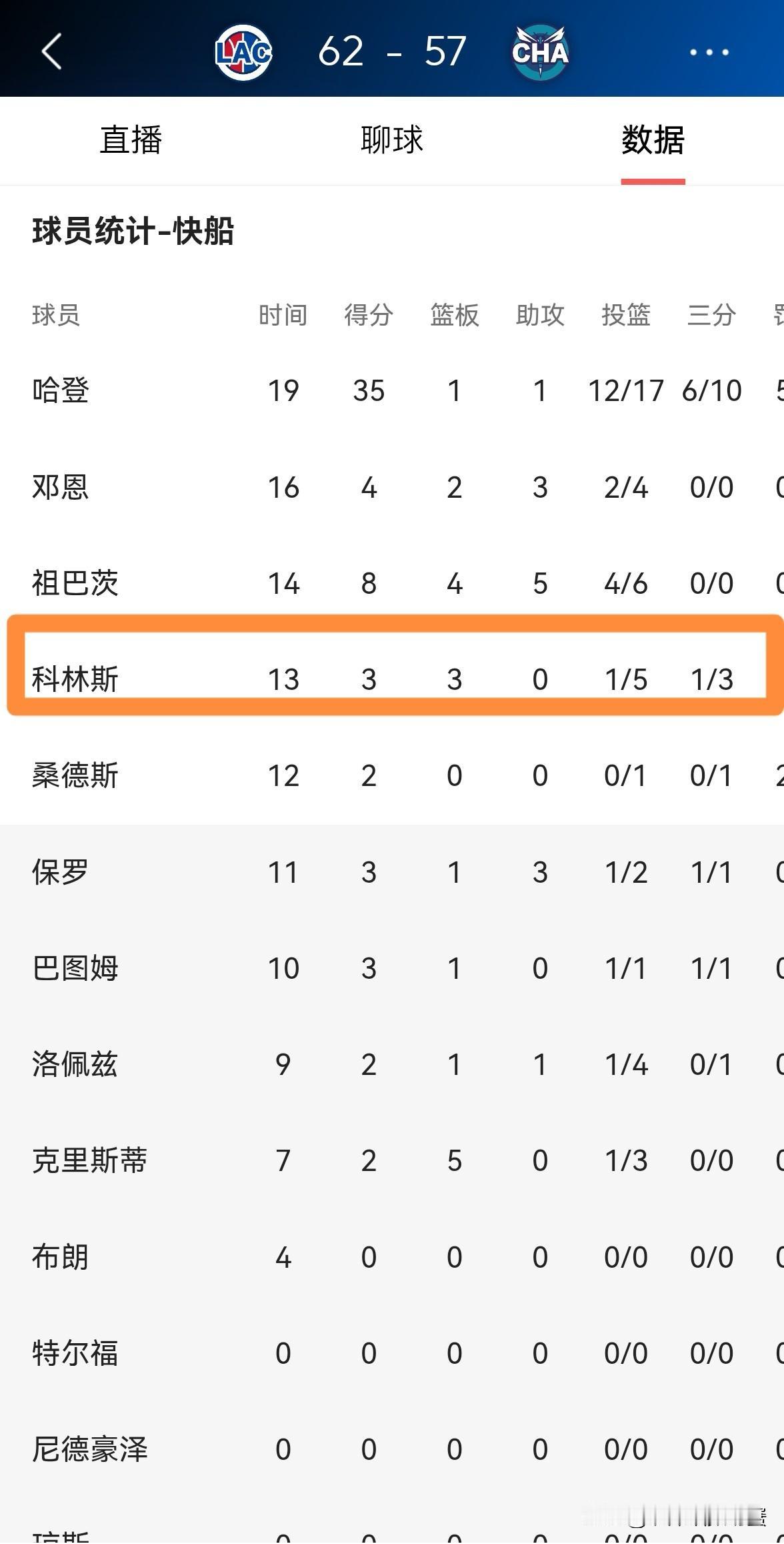快船大将科林斯真是不可救药了!在今天快船客场挑战黄蜂的比赛中,目前双方的上半场比赛已经结束,快船以62:57领先对手5分。在前两节比赛中,科林斯首发出战13分钟,投篮5中1,其中三分球3中1非常低效的得到3分,还出现了3次犯规。 坦白说,以科林斯在上半场比赛中的糟糕表现来看,他真的不配成为一名首发球员,他在攻防两端都无法为球队提供帮助。