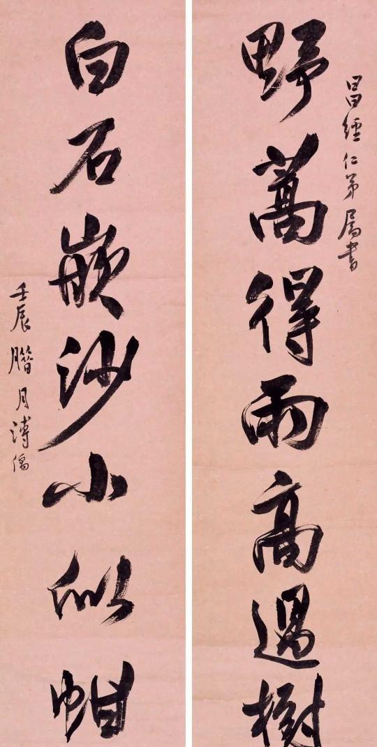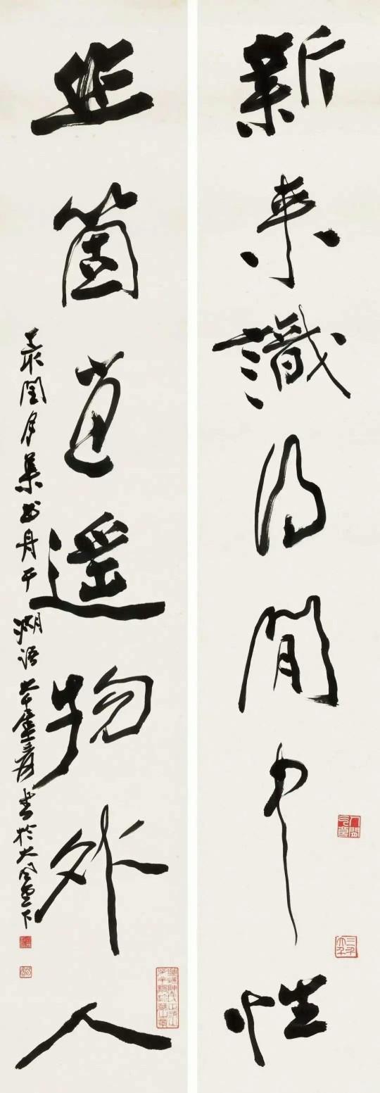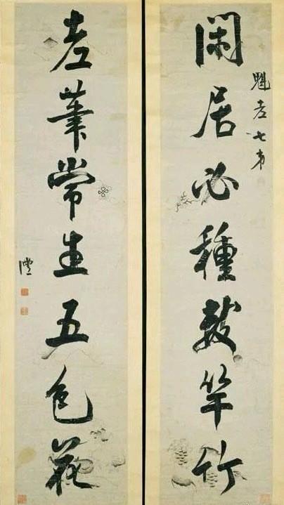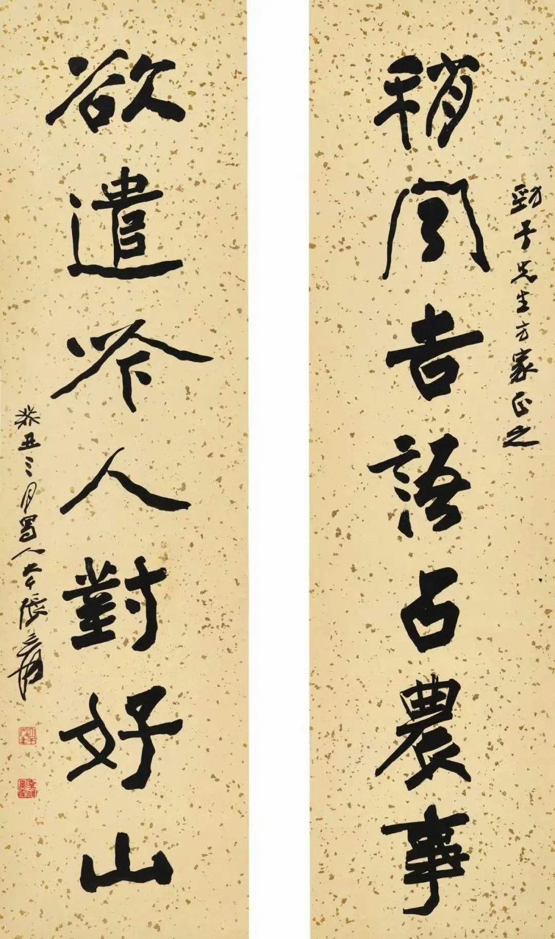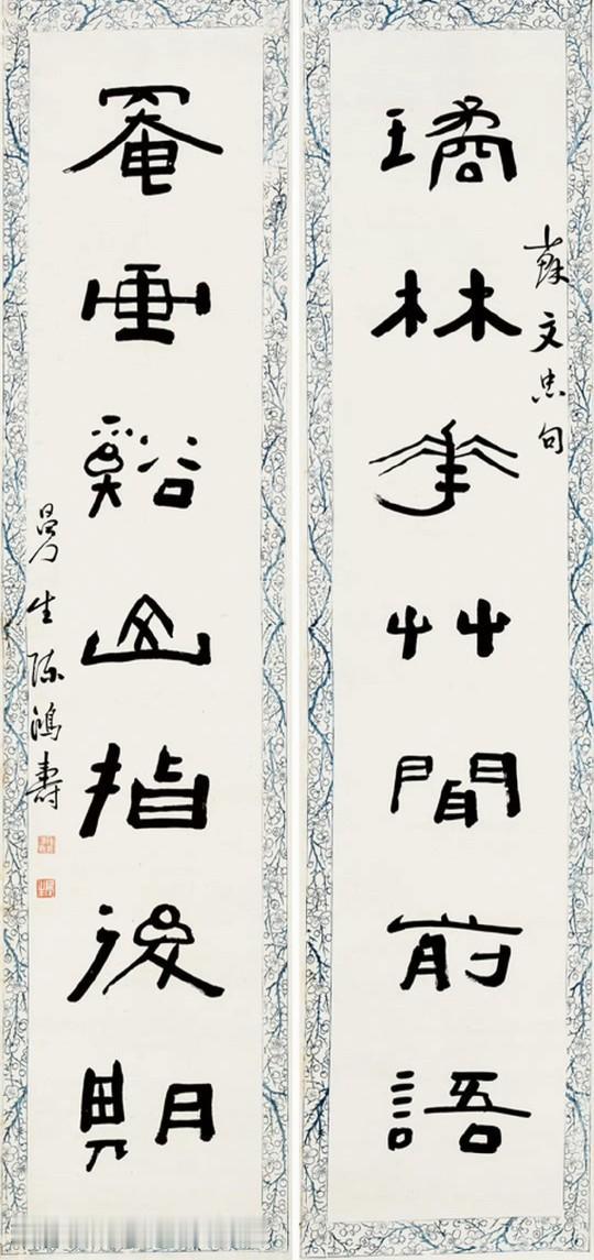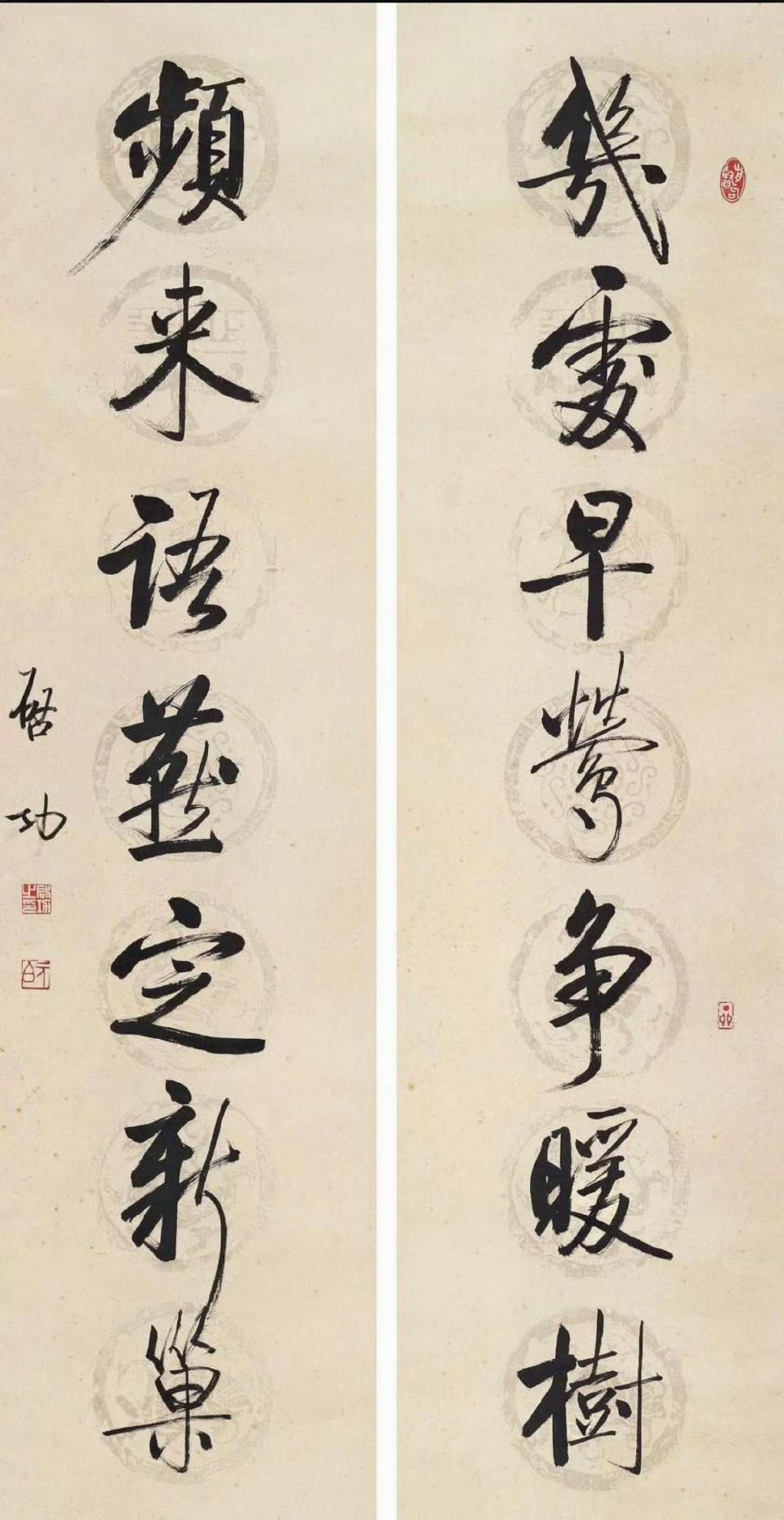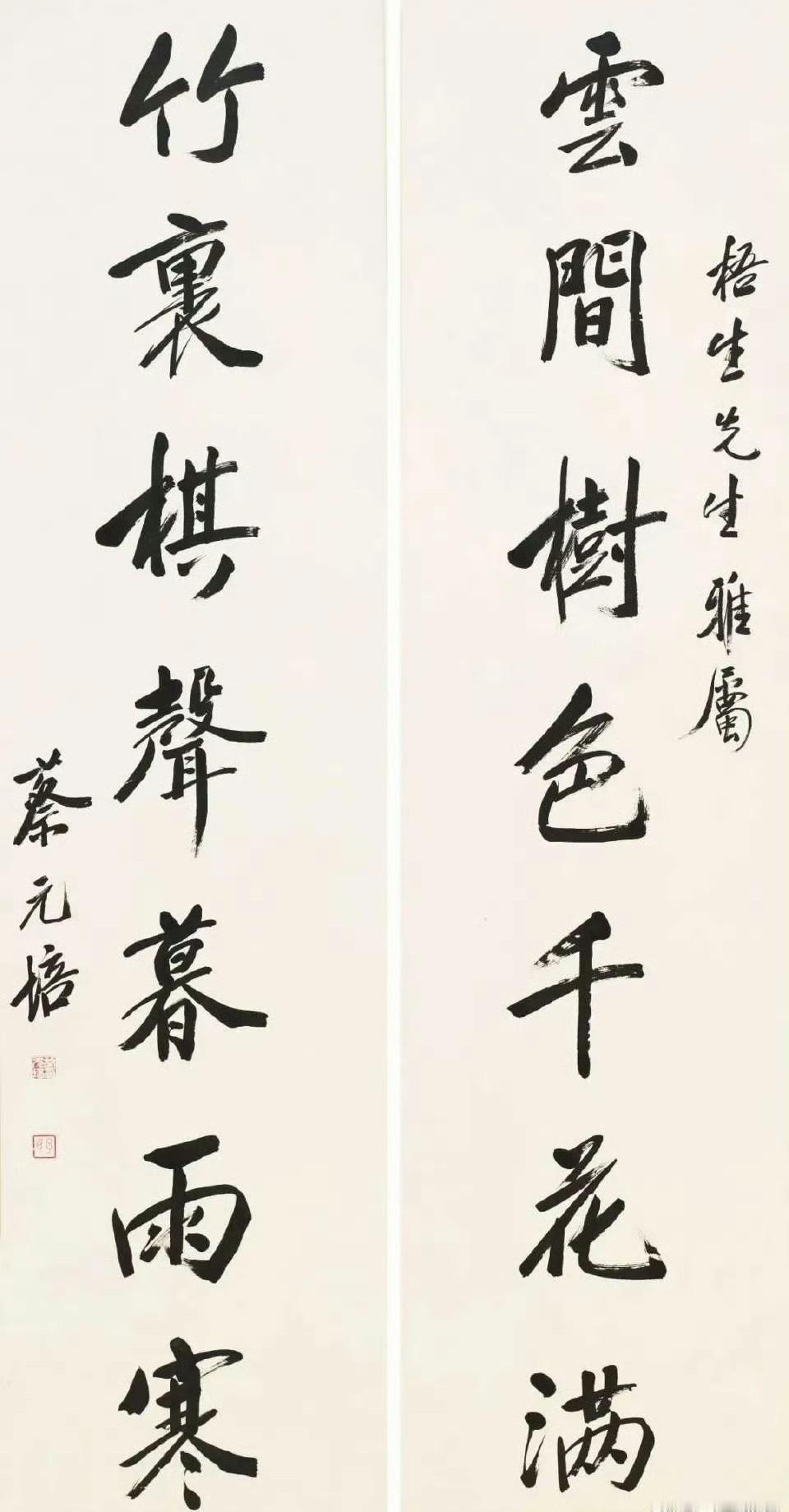 康有为 行书 七言联 《随时静录古今事,尽日放怀天地间》 张大千 行书 七言联 《新来识得闲中性,作个逍遥物外人》 张大千 行书 七言联 《稍闻吉语占农事,欲遣吟人对好山》 启功 行书 七言联 ​​​ 《几处早莺争暖树,频来语燕定新巢》 钱沣 行书 七言联 《闲居必种数竿竹,老笔常生五色花》 溥儒 行书 七言联》 《野蒿得雨高过树,白石嵌沙小似蚶》 陈鸿寿隶书 七言联 ​​​ 《琼林花草闻前语,罨画溪山指后期》 吴昌硕 破体书七言联。 《荒山野水破茅屋,商盘夏鼎周尊彝》 蔡元培 行书七言联 《云间树色千花满,竹里棋声暮雨寒》