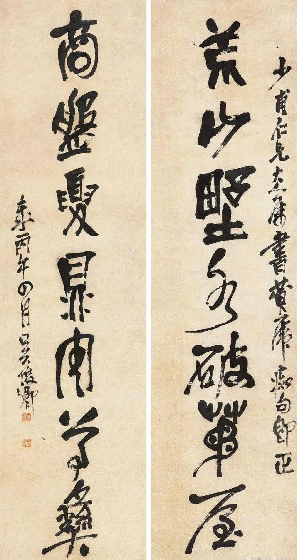 康有为行书七言联 《随时静录古今事,尽日放怀天地间》 张大千行书七言联