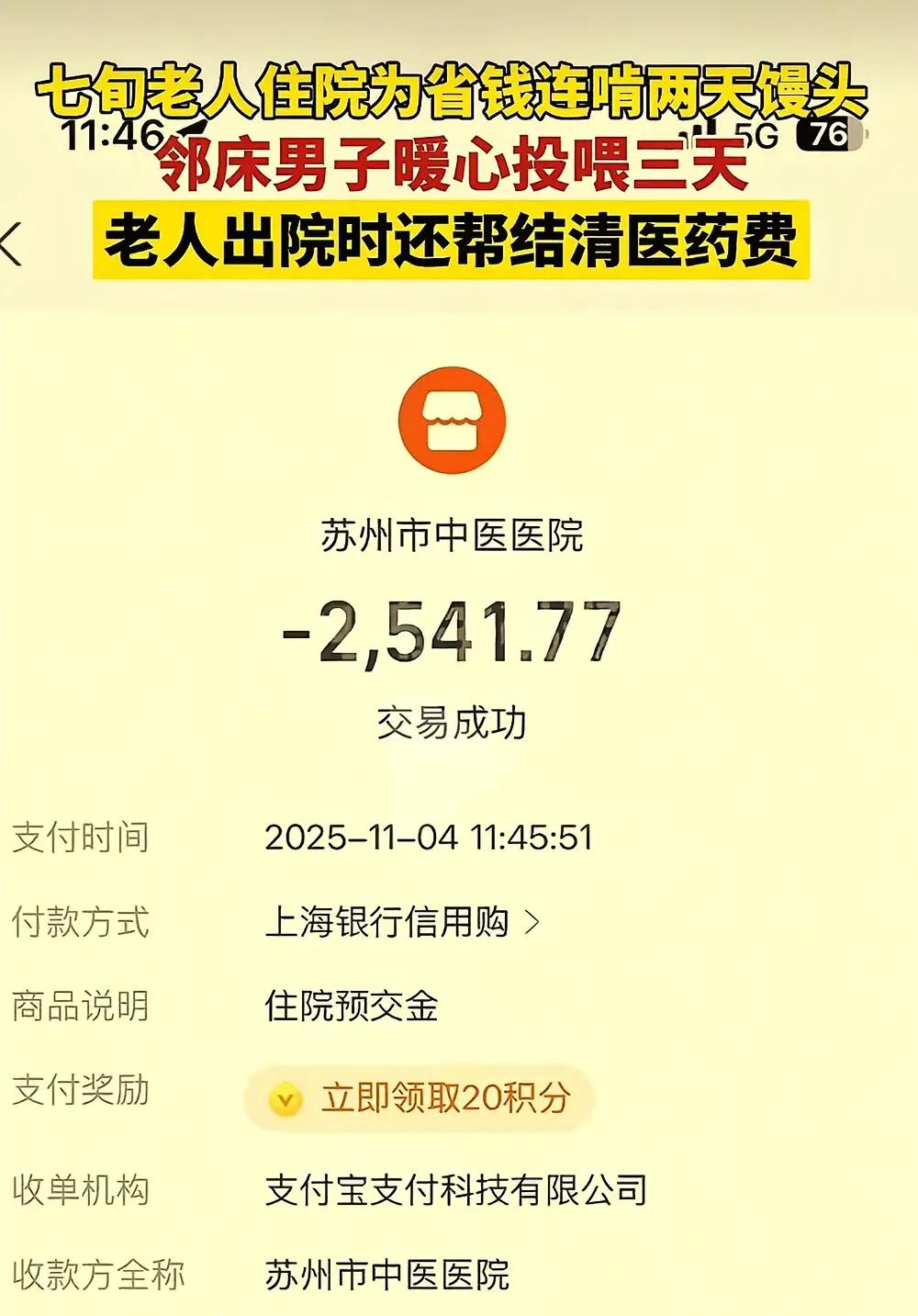 江苏苏州,七旬老人住院,为了省钱,连啃两天馒头!邻床小伙看到后,心里满是同情。于是多点了一份外卖,谎称外卖送多了。而接下来小伙的做法, 让老人哽咽流泪!网友:给老人买几顿饭我做的到,但是给老人结清医药费, 我是绝对做不到 江苏苏州,一座古老而又充满现代气息的城市,似乎从未停止过对生活的追问与思考。而就在这座城市的一家医院里,一幕温暖人心的故事悄然上演,让无数网友为之动容。 那天,七旬老人因为突发疾病被送进了医院。病房里,老人脸色苍白,眼神中带着一丝无助。出于经济拮据,他在住院期间,为了节省每一分钱,竟然连续两天只吃馒头,没有一丝多余的肉汤或营养补充。那份坚韧,也许是岁月的磨砺,也许是对生活的无奈,但更多的是一种对家庭的责任感——老人不愿让家人担心,自己硬扛着。 邻床的小伙子看在眼里,心里满是同情。作为年轻一代,他对老人那份坚韧不拔的精神深感敬佩,但也不忍心看着老人如此辛苦。于是,他偷偷多点了一份外卖,谎称“外卖送多了,帮老人吃一点”。这个善意的谎言,仿佛是一束温暖的阳光,照亮了老人那略显疲惫的脸庞。 然而,小伙的做法远不止于此。出于对老人深深的关怀,他决定用更实际的行动来帮助老人。当天晚上,他偷偷用自己的微信转账,悄悄买了一份营养丰富的饭菜送到老人床边。老人看到后,眼眶湿润了,哽咽的声音中带着难以掩饰的感动:“谢谢你,小伙子,你比我家人还贴心。” 这份温暖,瞬间在网络上传开。网友们纷纷点赞,感叹善意的力量:在这个快节奏、物欲横流的时代,一份真诚的关怀如此珍贵。有人评论:“给老人买几顿饭我做得到,但帮老人结清医药费,绝对做不到。”这句话点出了许多人的心声——我们都愿意伸出援手,但现实的困难让许多善意变得遥不可及。 其实,这个故事背后折射出的是我们对“人性”的深刻洞察。在物质匮乏与精神富足之间,许多人都在寻找平衡点。老人那份坚韧,令人敬佩,但也让我们反思:在这个社会,怎样才能让每一个像老人一样的弱势群体都能感受到温暖和尊重?我们是否真的尽了自己最大的努力去帮助那些需要帮助的人? 有人说,善意是一种传递。一个小小的善举,或许无法解决所有问题,但它可以点亮一盏灯,照亮更多人的心。或许,我们不能每个人都成为“救世主”,但我们可以成为身边人的温暖陪伴。那份在医院里,默默为老人买饭、送温暖的年轻人,他的行动像一股暖流,温暖了老人,也温暖了我们每一个看到故事的人。 更值得思考的是,社会的关怀体系是否健全?我们每个人都在为生活奔波,是否有更好的方式,让那些像老人一样的弱势群体不再孤单?或许,除了个体的善意,我们更需要制度的保障。比如,完善的医疗救助、社区的帮扶机制,让那些生活在边缘的人们,能够在困难时刻得到及时的帮助。 这个故事让我们看到:善良并不稀缺,关键在于我们是否愿意去行动。也许,下一次轮到你我,面对需要帮助的人时,能不能也像那位小伙子一样,伸出援手?也许,下一次你我也能成为那个温暖他人的“陌生人”。 最后,愿我们都能在平凡中发现不平凡的善意,用行动点亮别人的人生,也让这个社会变得更加温暖和有希望。因为,正是这些微小的善举,汇聚成了我们共同的美好未来。苏州照顾老人
