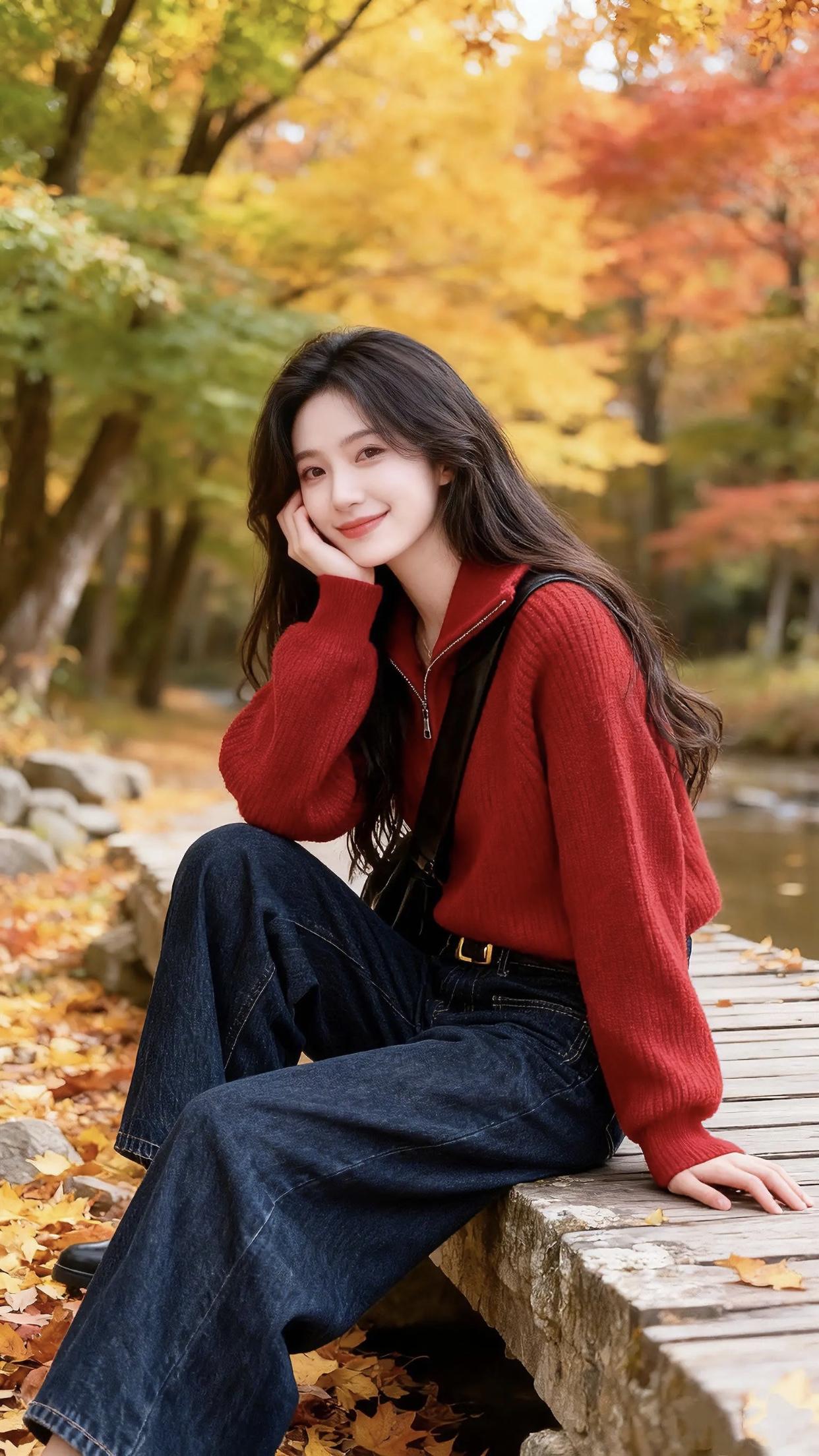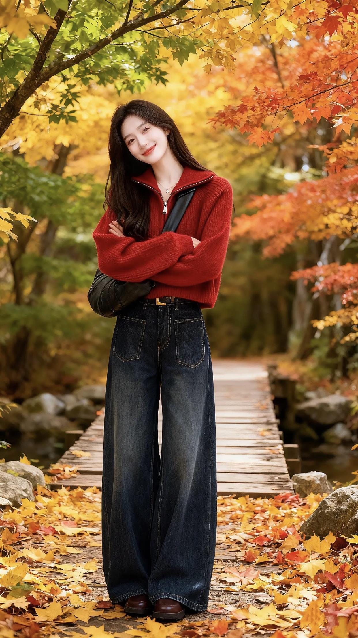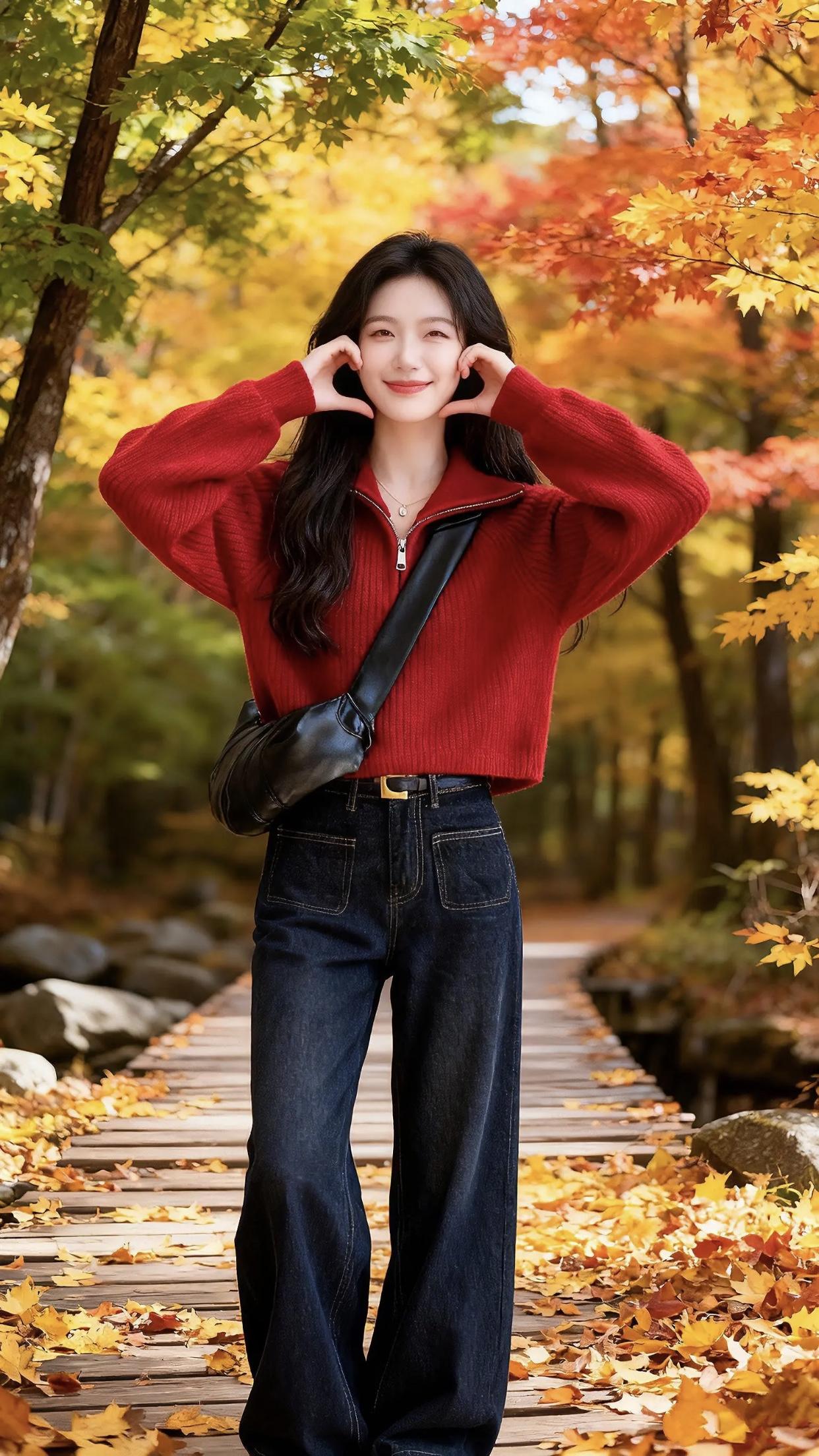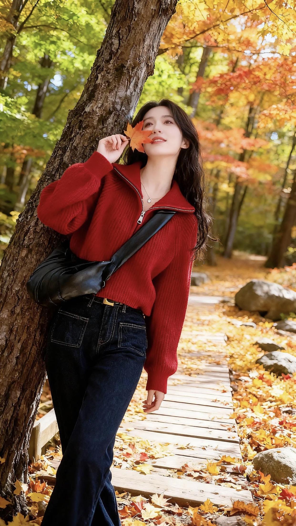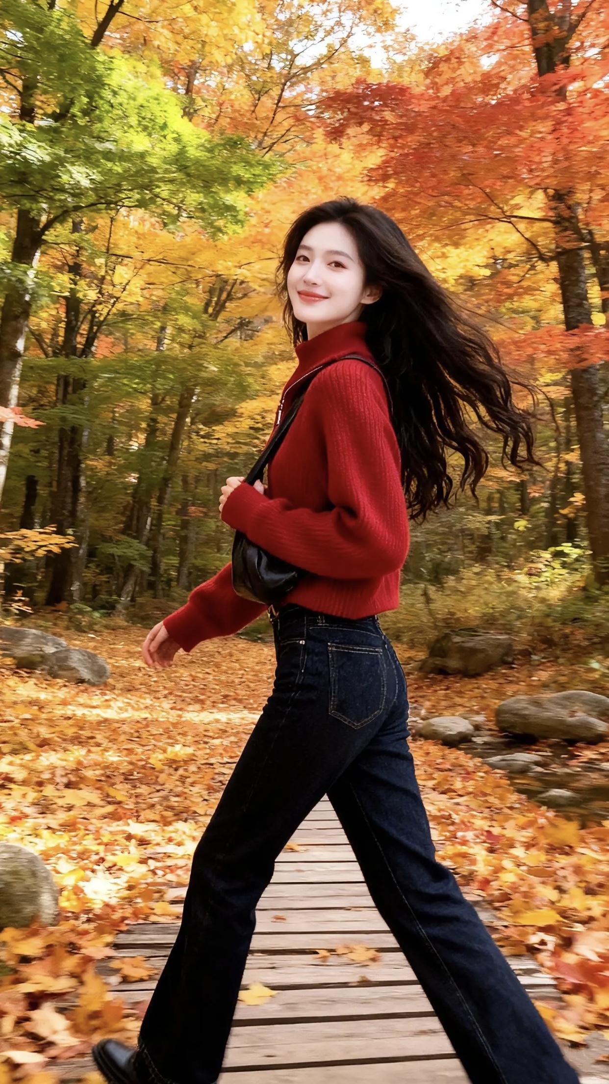 什么样的女生称得上是美女?秋日漫步,红衣少女与落叶共舞